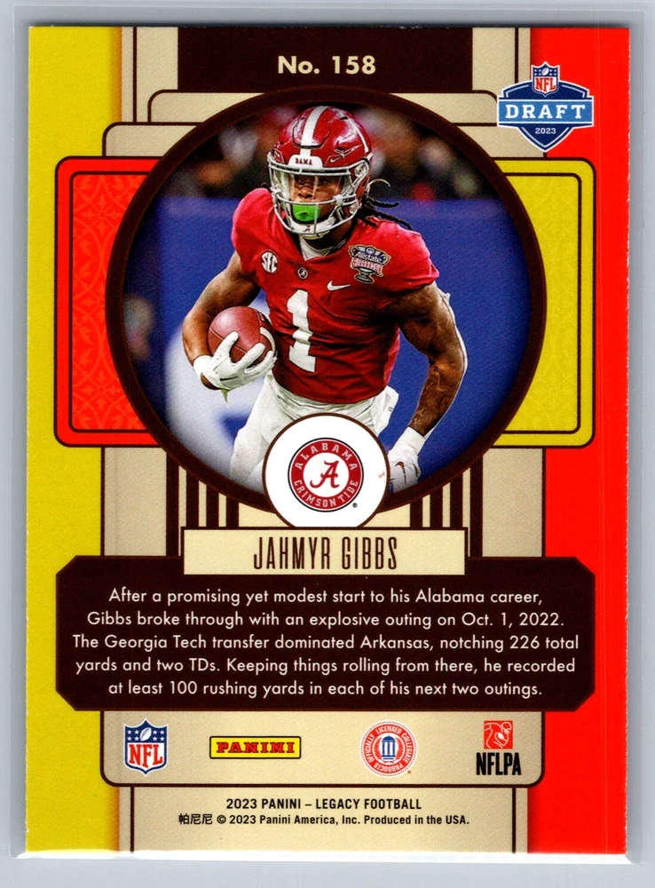 This is a nice example of a 2023 Panini Legacy #158 Jahmyr Gibbs Rookie. *Cards are scanned using a High Resolution scanner, and are scanned with a penny sleeve on them so they are protected from getting scratched/damaged during the scanning process. Light scratches that are seen on the scans are on the penny sleeve not the card in most cases. Feel free to request more images with the penny sleeve removed. I will try to respond with-in 24 hours with the image requests in most cases.* *Chrome cards (Topps Chrome/Prizm/Optic/Mosaic) might have minor light surface scratches which is typical with these type of cards. Any major deep scratches will be stated if any are present. All single cards will come in protective cases. If you purchase a listing that's sold as a lot it may come in a team bag with multiple cards in a oversized toploader, and not all cards will be individually top loaded in all lots. Check out my other listings! New listings daily !!!