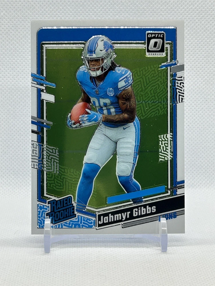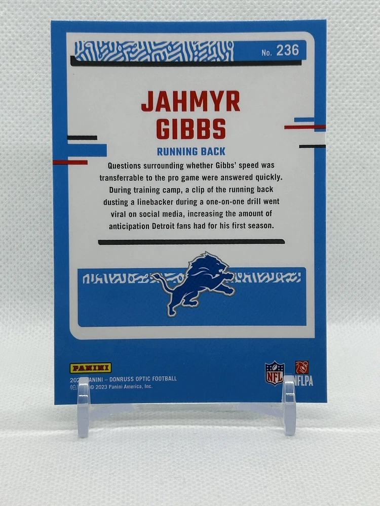 UPC: Does not apply Player/Athlete: Jahmyr Gibbs Autographed: No Set: 2023 Panini Donruss Optic Manufacturer: Panini Year Manufactured: 2023 Sport: Football Card Thickness: 35 Pt. Card Name: Rated Rookie Country/Region of Manufacture: United States Team: Detroit Lions Autograph Authentication: Donruss Card Number: 236 gtin13: Does not apply Card Size: Standard Vintage: No Features: Base Set, Rookie Parallel/Variety: Optic League: National Football League (NFL) Material: Card Stock Season: 2023-24 Insert Set: Rated Rookie Original/Licensed Reprint: Original Language: English Type: Sports Trading Card