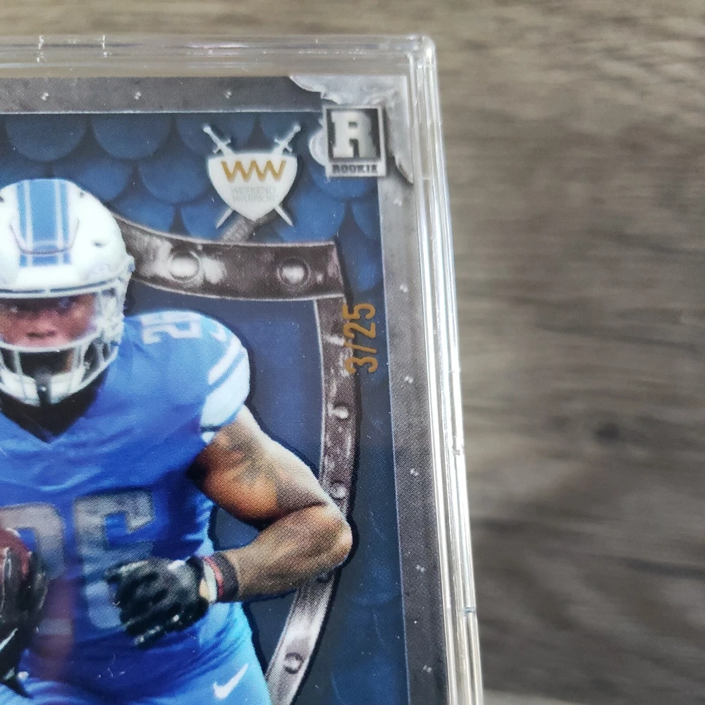 This Jahmyr Gibbs Wild Card Matte/25 sports trading card is a must-have for any football fan or sports card collector. With its sleek design and unique features, this card is sure to be a standout addition to your collection. The card is ungraded and comes from the Wild Card manufacturer, making it a rare find. As a rookie card with a serial number, this trading card is a valuable addition to any collection. It features Jahmyr Gibbs, a rising star in the football world, and is sure to impress. Don't miss out on this opportunity to own a piece of sports history.