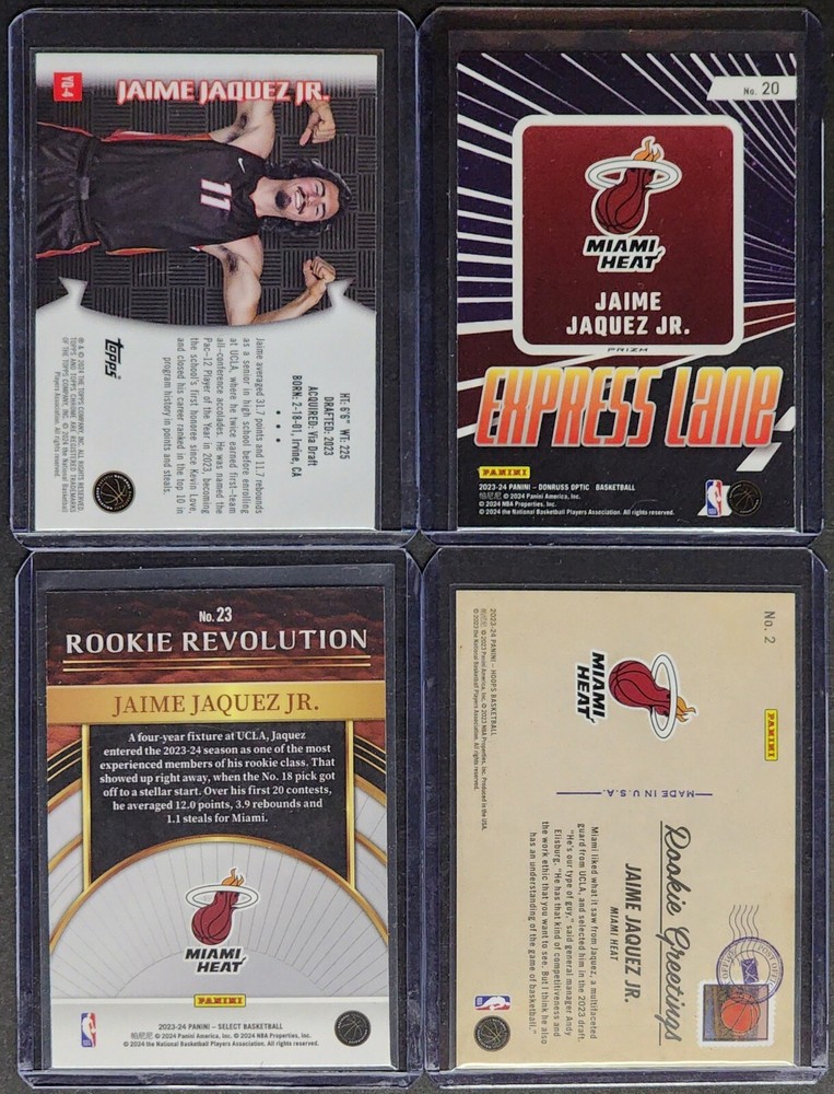Type: Sports Trading Card Season: 2023-24 Features: Hologram, Insert, Parallel, Rookie, Short Print Number of Cards: 4 Seller Notes: โ€œNear mint or better.โ€ Country/Region of Manufacture: United States Original/Licensed Reprint: Original Player/Athlete: Jaime Jaquez Jr. Team: Miami Heat Vintage: No League: National Basketball Association (NBA) Year Manufactured: 2023 Language: English Set: 2023-24 Panini Donruss Optic, 2023-24 Panini Select, 2023-24 Topps Chrome, 2023-24 Panini NBA HOOPS Autographed: No Manufacturer: Panini Material: Card Stock Card Size: Standard Sport: Basketball