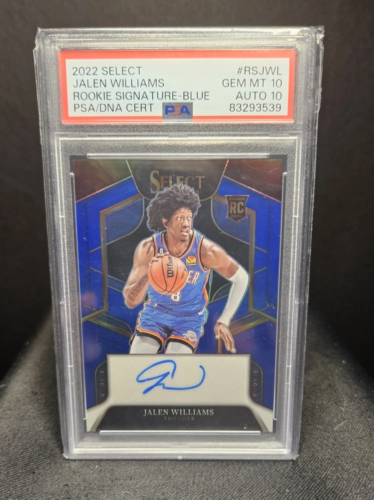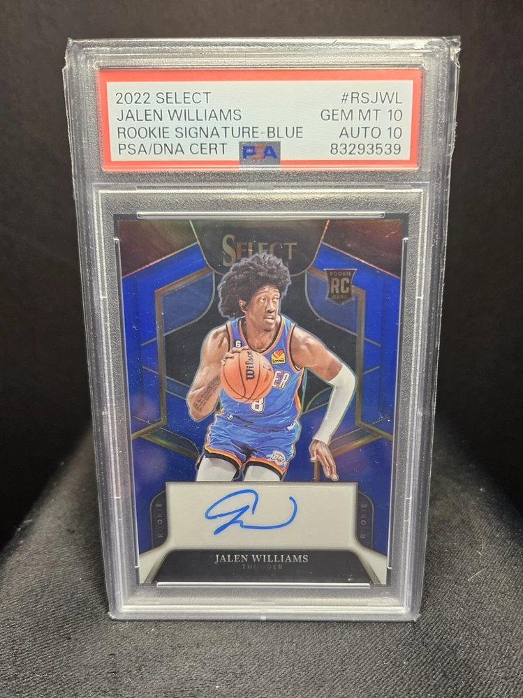 Jalen Williams RC Auto PSA 10/10 == #Match (#8/49) & Color-Blue ROOKIE Gem Mint VERY RARE SSP. The ultimate J-Will card: 1) Is a rookie card. 2) Is an autograph card. 3). A PSA10/10 Gem "Double Dime" 4). Is a color match (Being a BLUE variant and that matching the OKC Thunder). 5). Is the jersey # Match of the set.