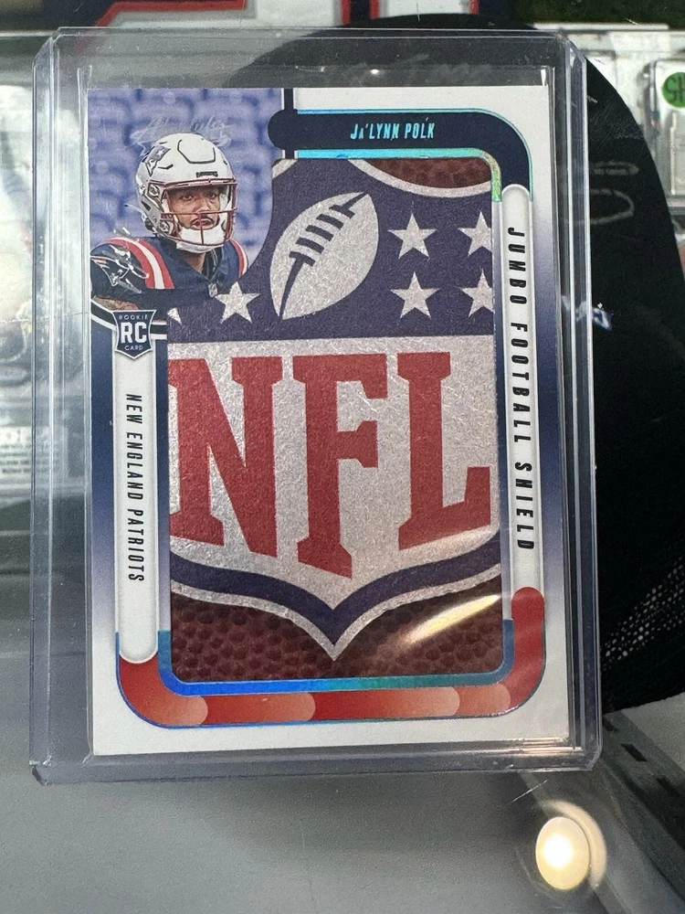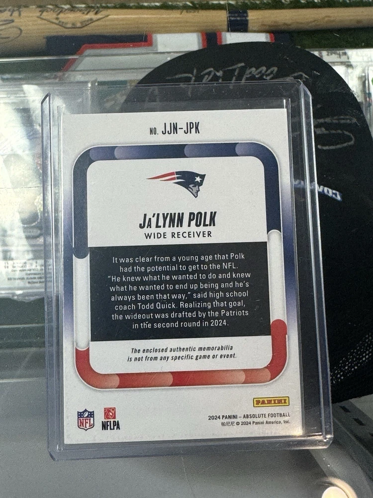 The product is a 2024 Panini Absolute sports trading card featuring Ja’lynn Polk from the New England Patriots. This one-of-one card is a rare NFL Shield parallel variety, making it a unique collectible item for fans and collectors alike. As a rookie player in the National Football League (NFL), this card holds special value and is a must-have for fans of the New England Patriots or collectors of sports trading cards.