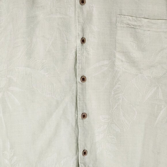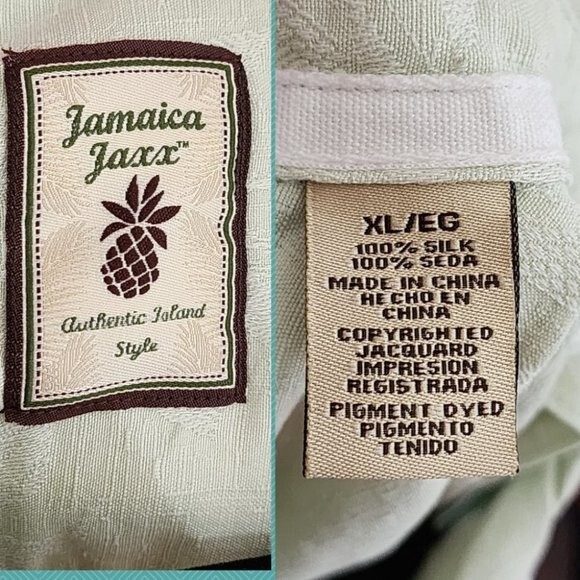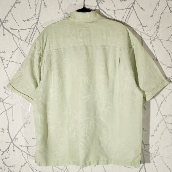 Jamaica Jaxx Pale Green Floral Jacquard 100% Silk Camp Shirt Men's XL Chest: 25" Length: 28" Good used condition: no rips, marks or stains.