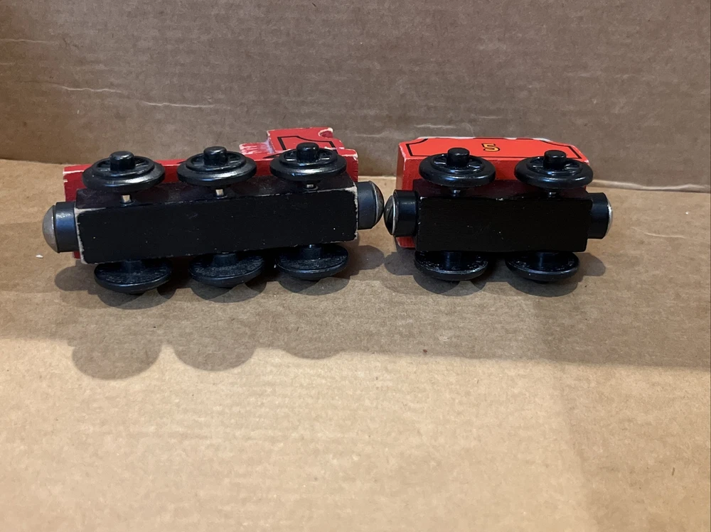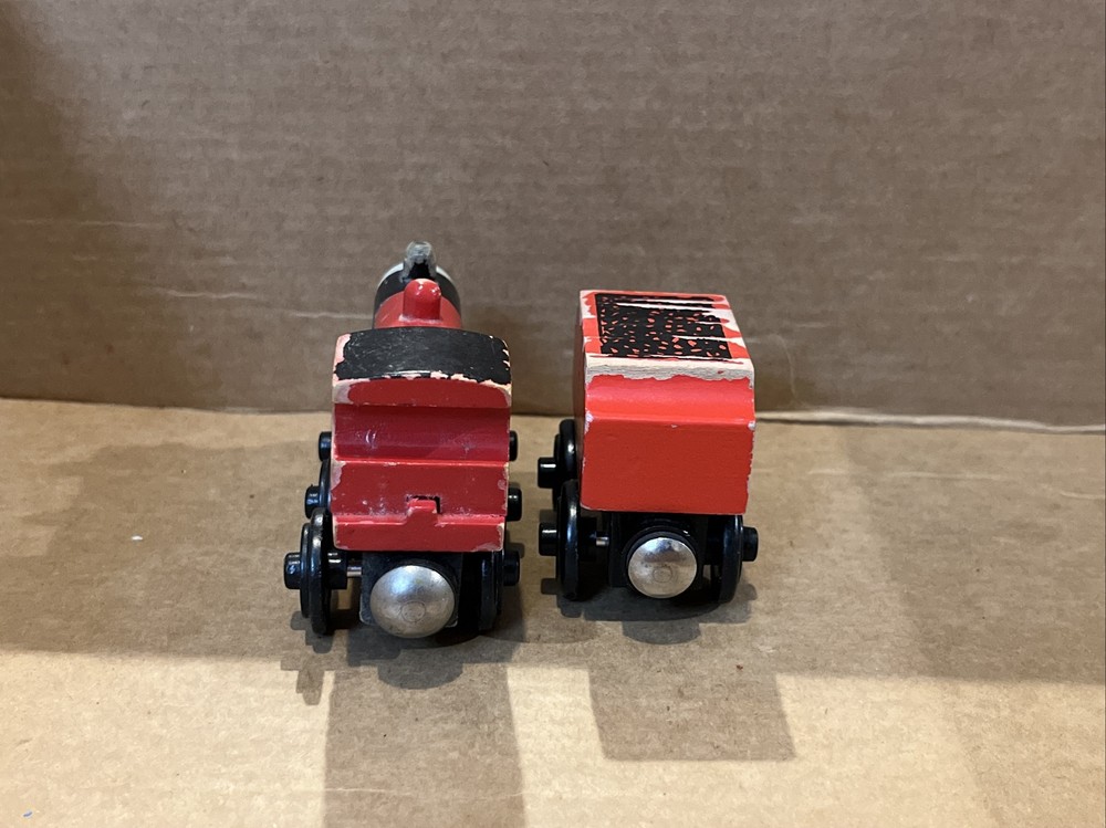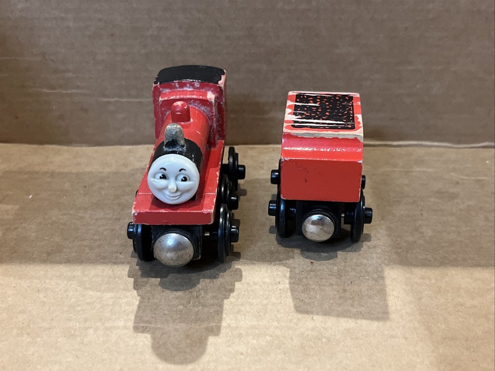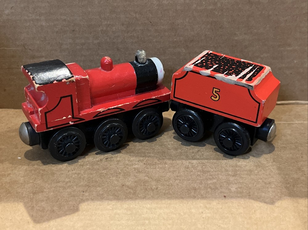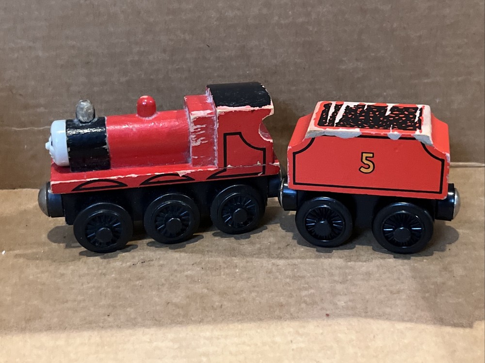 Thomas & Friends Wooden Railway Train Tank Engine - 1998 James and mismatched tender. See photos for wear and tear. Plenty to go around. Shipped USPS first class package.
