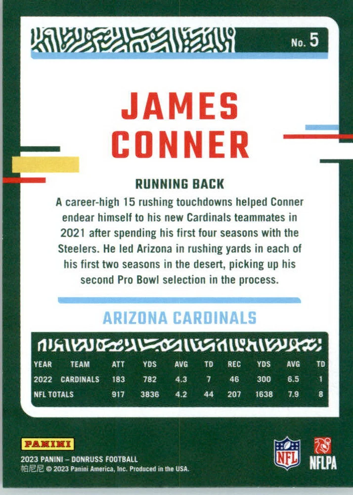 Set: 2023 Donruss Sport: FOOTBALL Team: Arizona Cardinals Card Number: 5 Type: Sports Trading Card Player/Athlete: James Conner Graded: No Autographed: No League: NFL Year Manufactured: 2023 Season: 2023