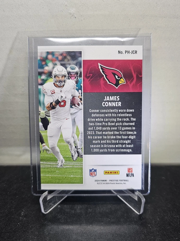 This is a James Conner 2024 Panini Prestige Power House #PH-JCR trading card featuring the Arizona Cardinals player. The card measures 3Β½" x 2Β½" and is an original, not a licensed reprint. It is part of the Panini Prestige Power House set and is a parallel variety, specifically a Power parallel. The card is not autographed and depicts an unspecified game. This card is perfect for any Football fan or collector, especially those who admire James Conner's skills on the field. It is a great addition to any sports trading card collection and is sure to impress with its unique design and rarity. Don't miss out on the chance to own this 2024 Panini Prestige Power House #PH-JCR trading card.