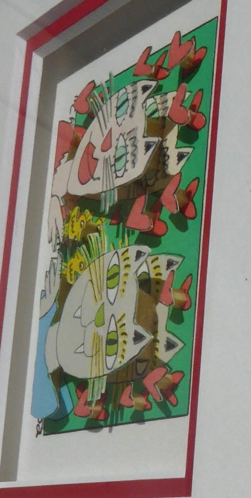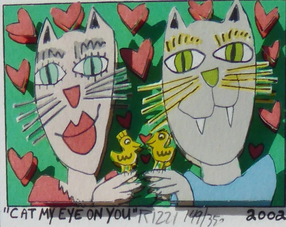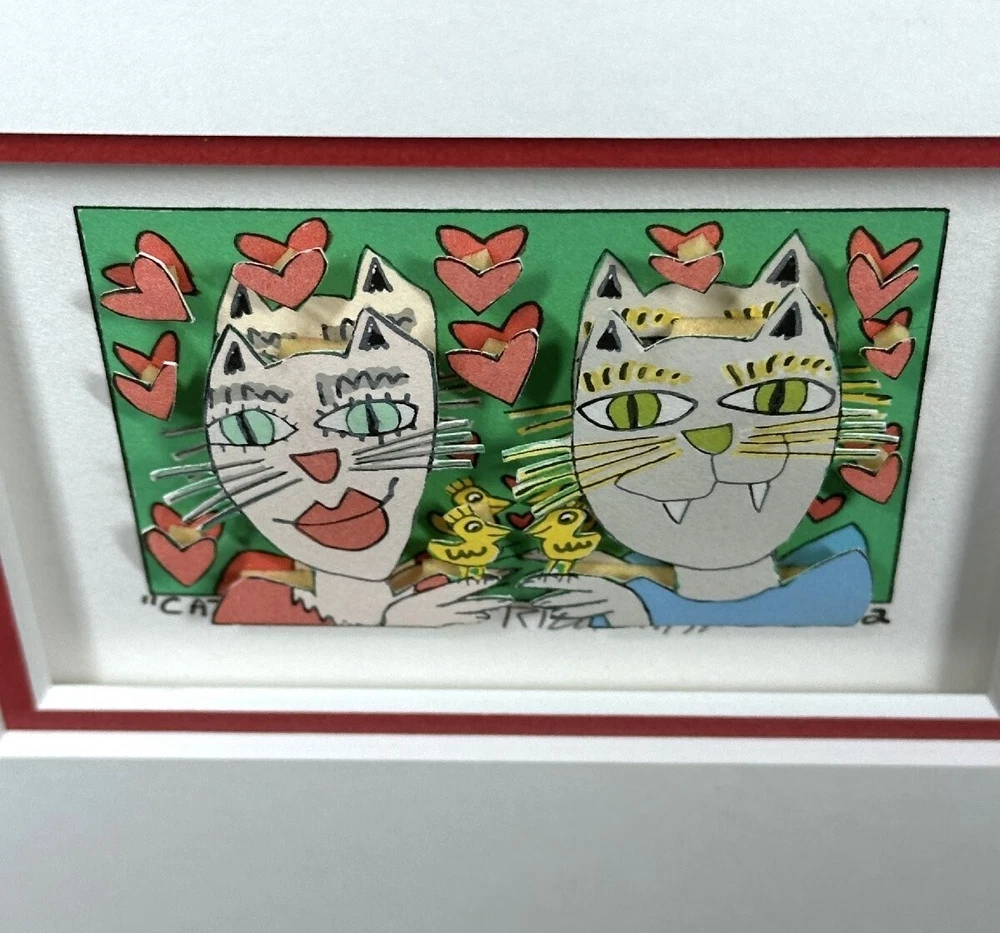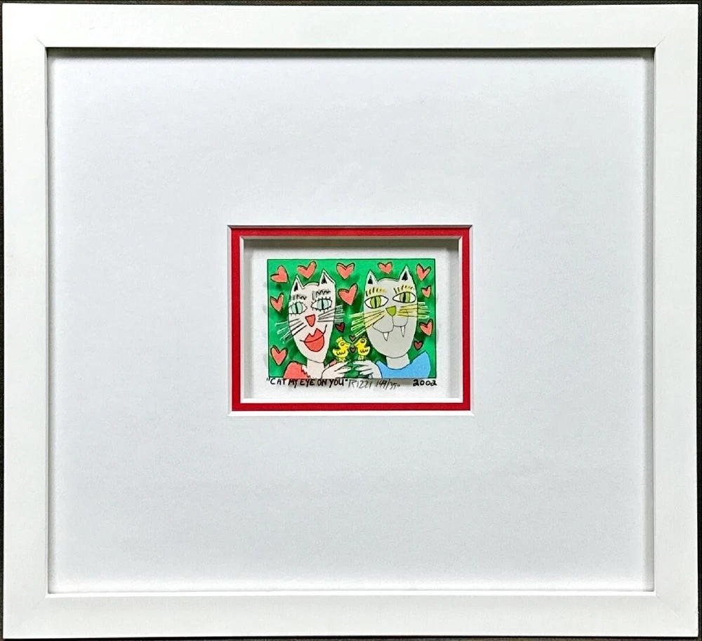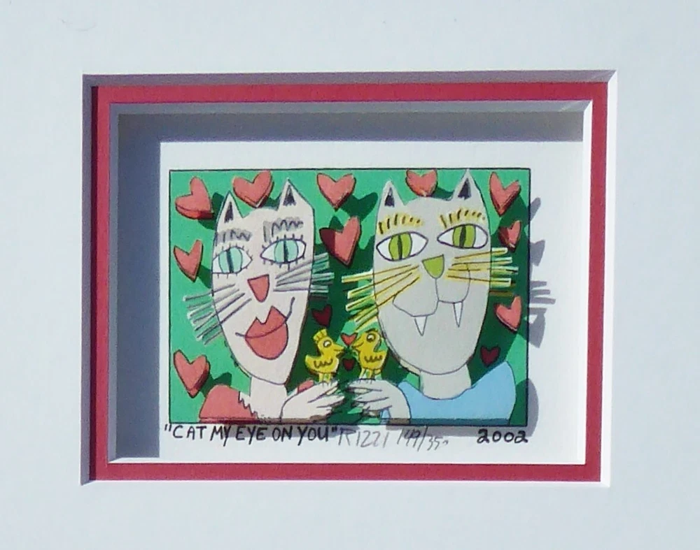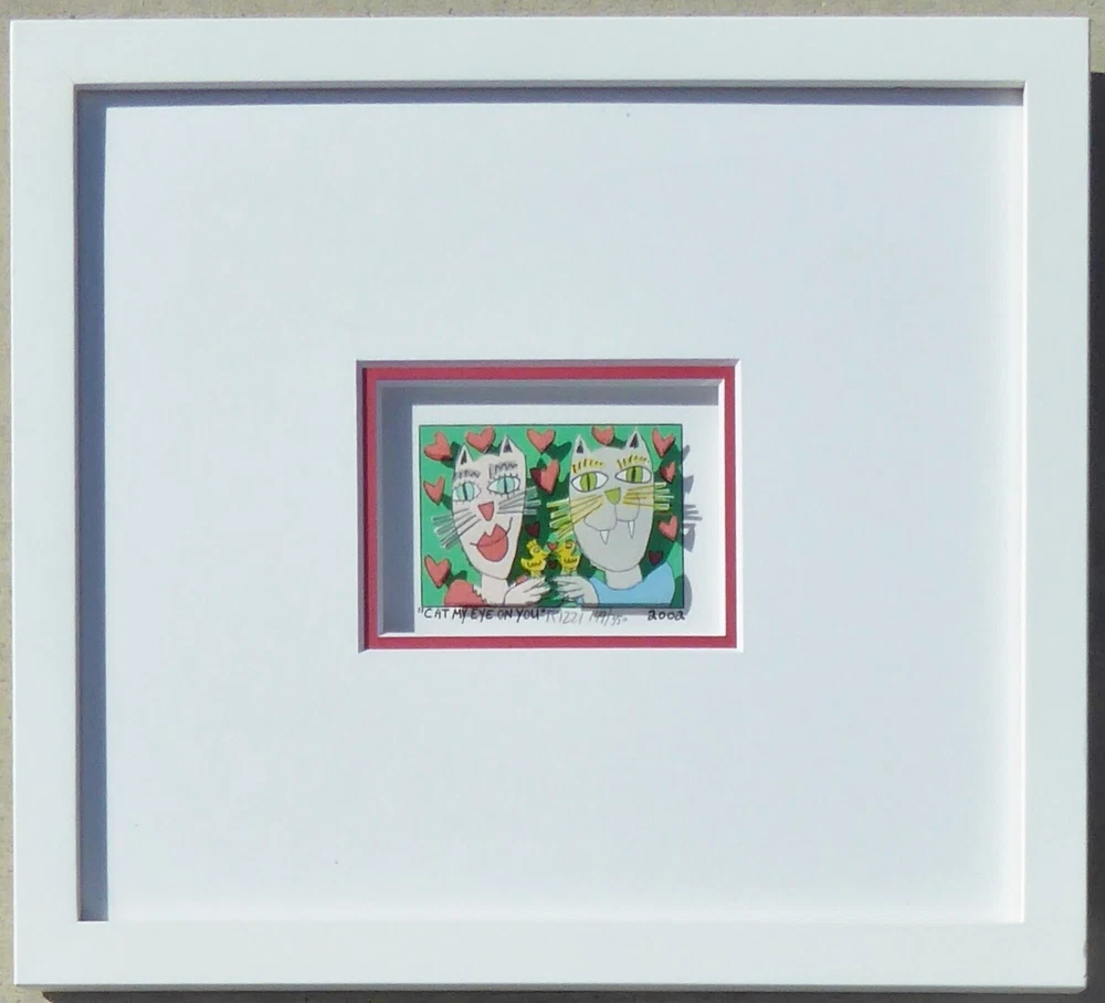 Very good condition, comes with FREE USED frame " CAT MY EYE ON YOU" 2002 "Cat my eye on you" is a 3-D mini original serigraph on paper by James Rizzi numbered 149/350 and hand signed by the artist. FREE USED Frame Measures approx. Size: 12" x 11" (30.5 x 28 cm) Image 7.5 x 5 cm (3" x 2" ) About the artist: (October 5, 1950 – December 26, 2011) was an American pop artist who was born and raised in Brooklyn, New York. d During his lifetime one of the most popular artist, a real „Pop Artist“. He became famous through his invention of the 3D-construction on paper and the 3D-magnetic objects. Since the 1970s those inventions are always connected with his art. This piece will be carefully shipped. Buyers are responsible for import duties/fees/taxes. Please note that colors on screen may vary slightly from actual artwork due to digital device screen calibration. Worldwide shipping available. Buyer is responsible for import duties/fees/taxes. See my other listings for more art. Thank you for looking!
