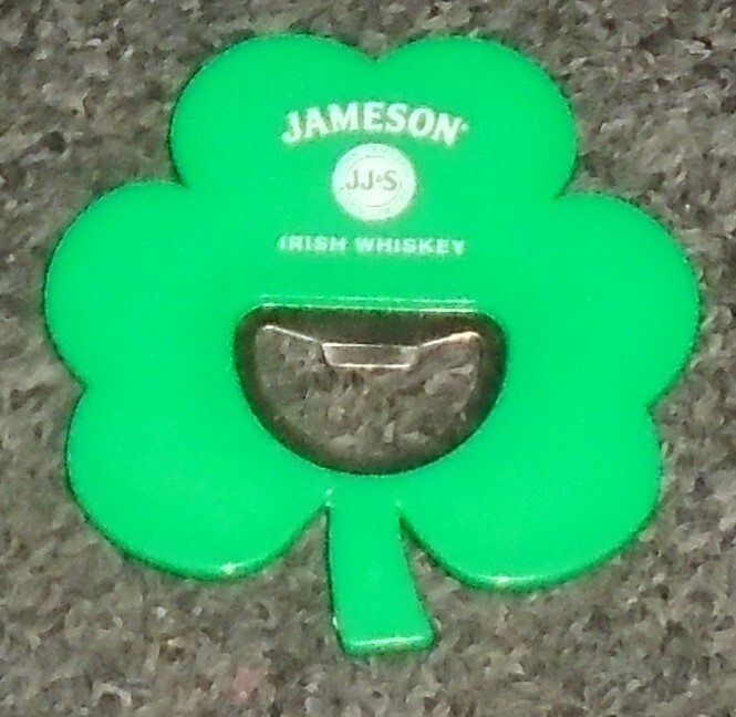 7 Jameson Irish Whiskey approx. 3 1/2 x 3 1/2 bottle cap opener shamrock clover shaped NEW stored loose. S&H is FREE I cannot guarantee pet or smoke free environment I DO NOT SHIP OUTSIDE THE US Accepted Payment Options: Paypal I will combine shipment if possible to save on postage for multiple auctions. Check Out My EBAY STORE for more GREAT ITEMS! I go to the Post Office twice a week. This item mailed GROUND Rate with an estimated delivery time of 1-3 weeks upon ship date not counting Sundays/Holidays. PLEASE NOTE THESE ARE ONLY ESTIMATES, SOMETIMES DELIVERY MAY TAKE LONGER, ESPECIALLY GROUND/BOOK RATE WITHIN THE US CAN TAKE UP TO 4-6 WEEKS TURNAROUND TIME DUE TO MISDIRECTED AND/OR DELAYED MAIL AS HAS BEEN ADVISED BY THE POST OFFICE Shipment to Alaska, Hawaii, Guam, PR can take longer (3-6 weeks or more). Thanks for looking & Happy Bidding!