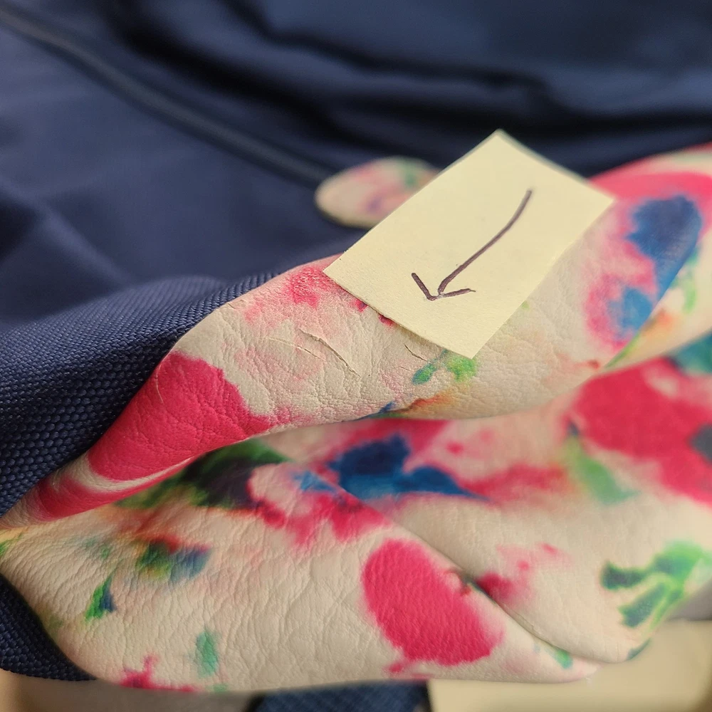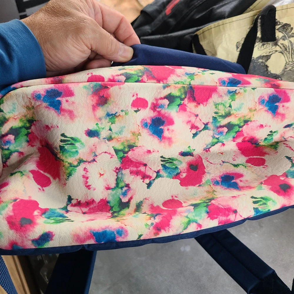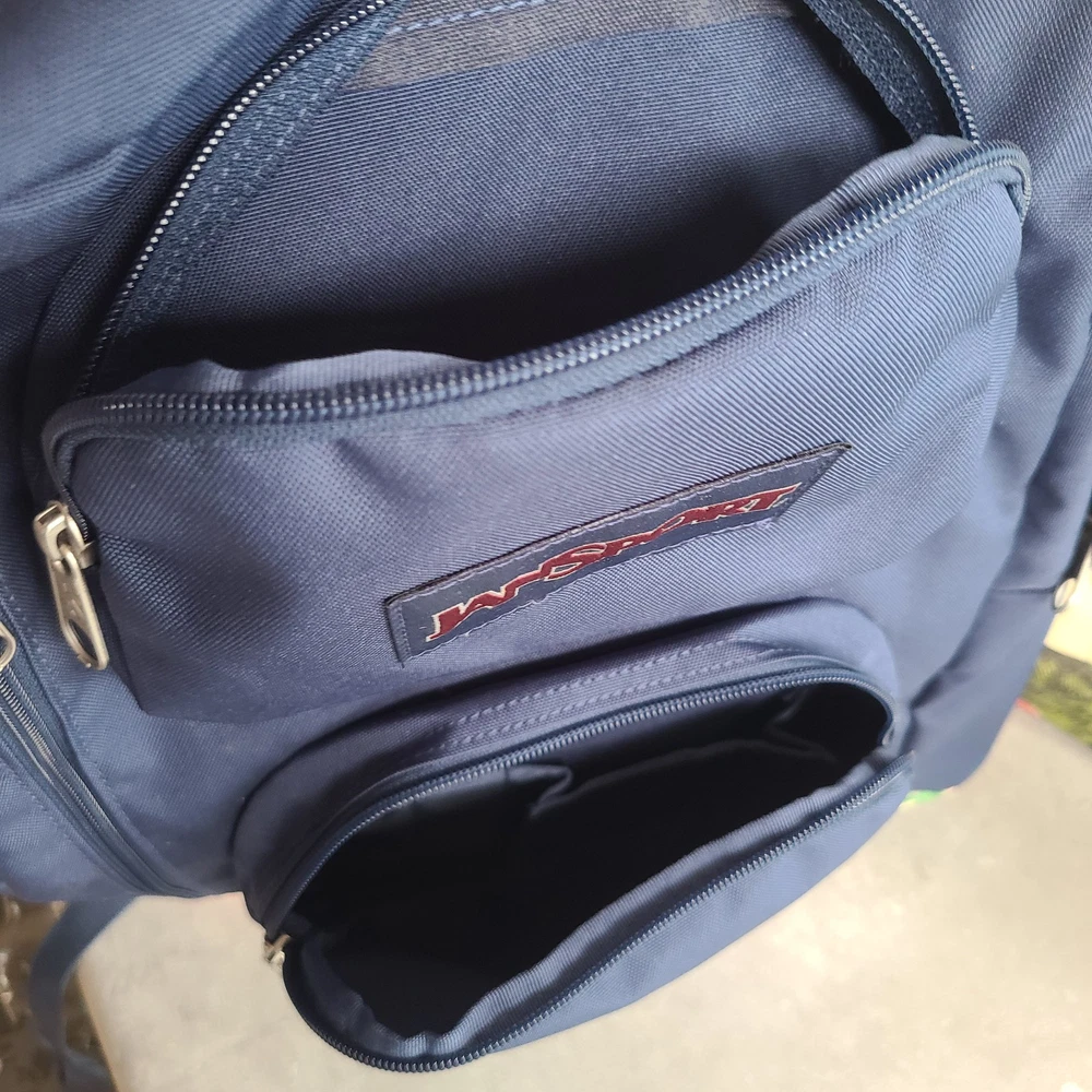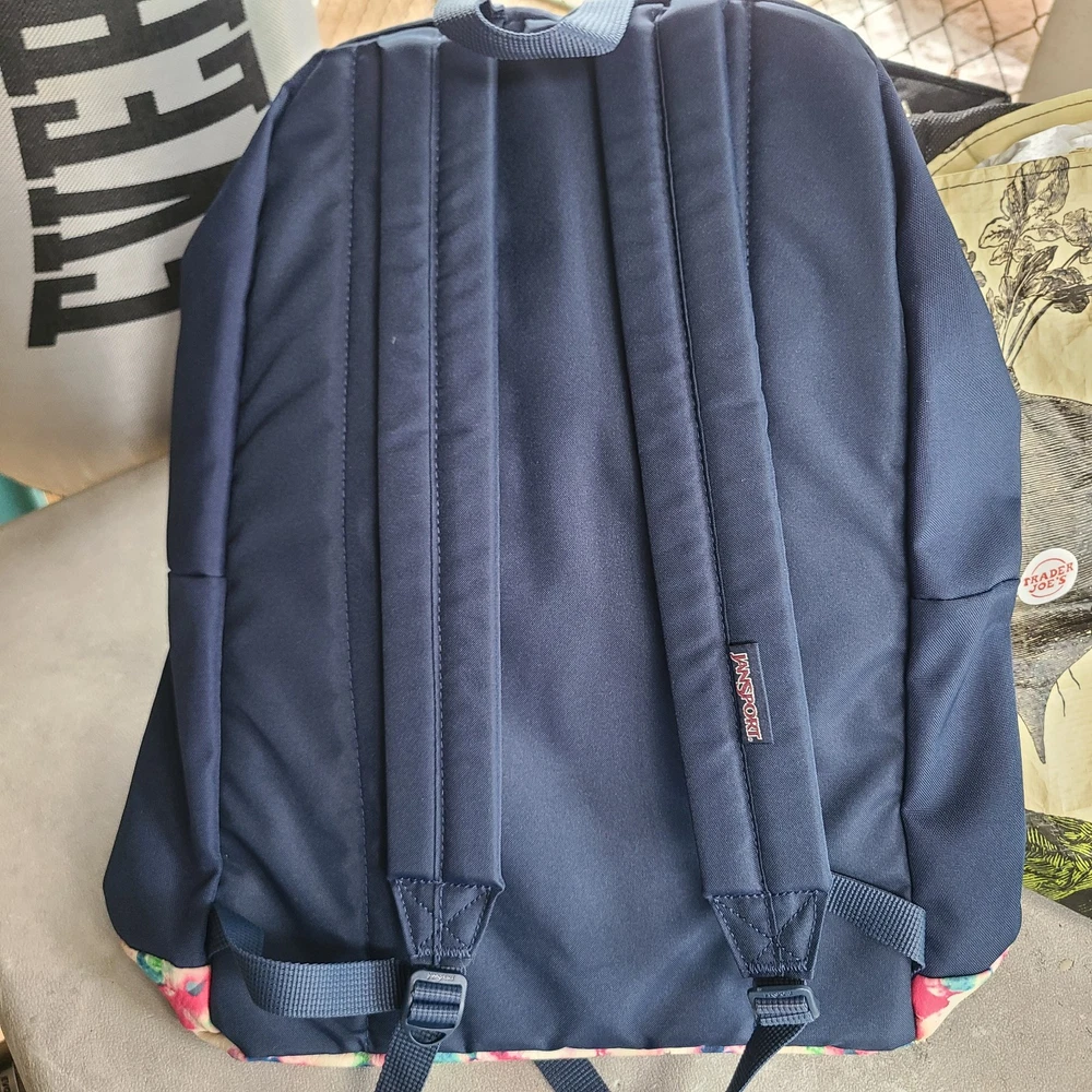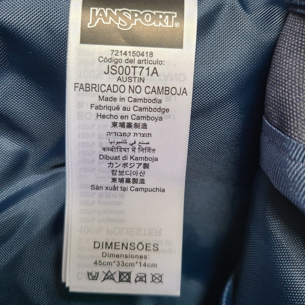 GREAT CONDITION JanSport AUSTIN backpack in Stella Blue with a floral pattern on the bottom. It is a large size backpack made of canvas with faux leather accents on the strap and zipper. The bag features inner and outer pockets, a laptop sleeve, adjustable straps, and the JanSport T71A model. The design is centered around a flower theme, making it a stylish choice for girls. With few flaws
