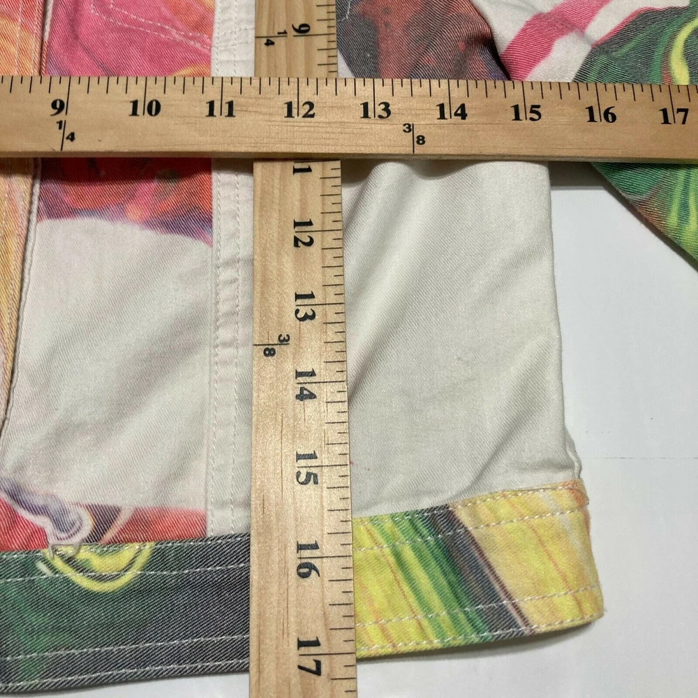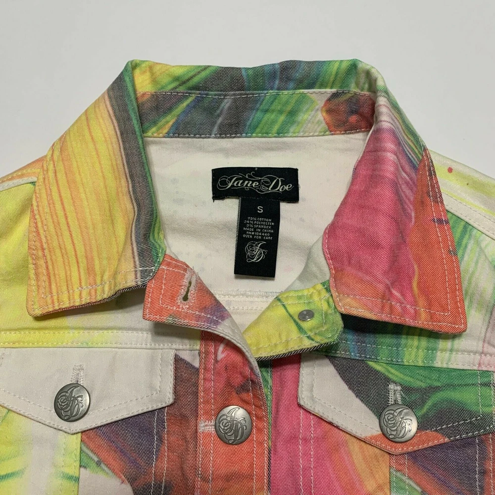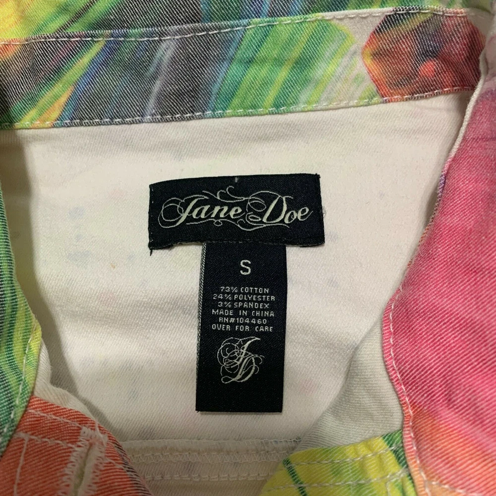 Jane Doe Cropped Jacket S Womens Multicolor Abstract Collared Button Front • Collared Neckline • Button-Front • Long sleeve • Color Multicolor • Front Pockets • Cropped Jacket / Jeans Jacket / Denim • Abstract • Features Collared/Comfort/Lightweight/Pockets • Casual/Informal/Classic • Relaxed/Comfort • Fall/Winter/Spring Measurements • Size Small • Length from Shoulder: 17" • Pit To Pit: 15" • See the Photos for more details of the measurements. Materials • 73% Cotton • 24% Polyester • 3% Spandex Condition Good Preowned Condition. Browse our store for new listings! We sell great brands at a steep discount. New items are added daily. We ship items out EVERY DAY so EXPECT a QUICK delivery! We provide rigorous quality control and inspection of all items in our shop.