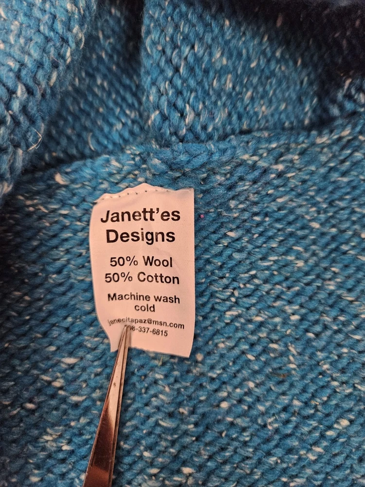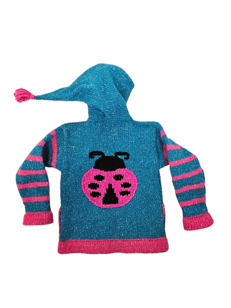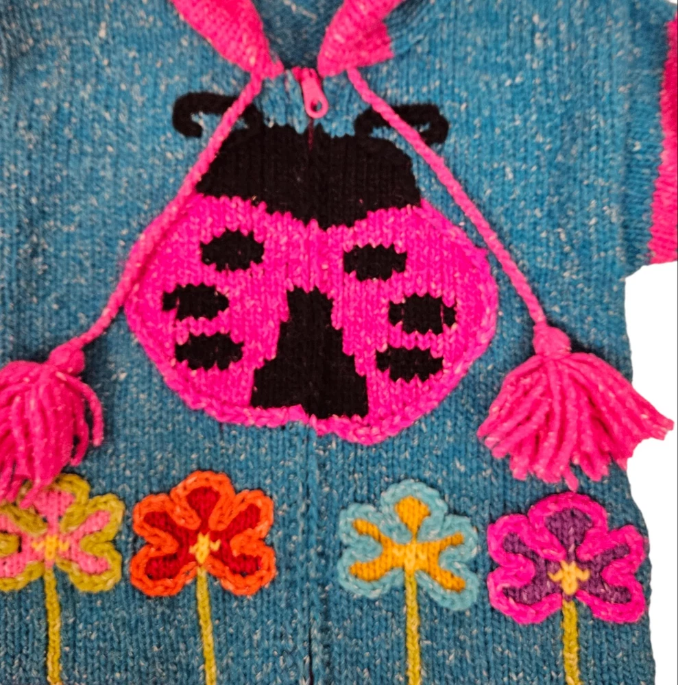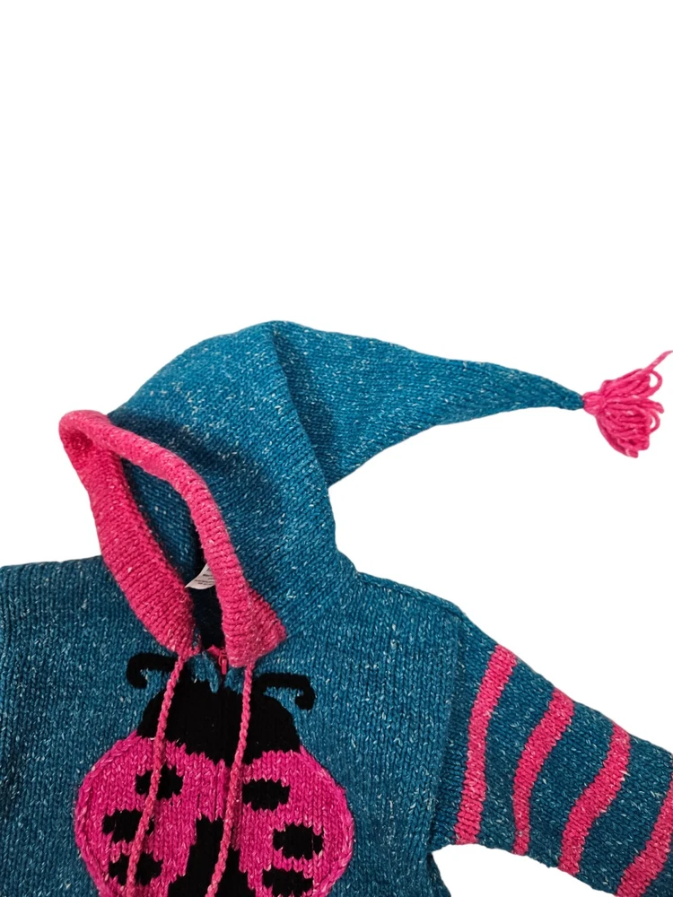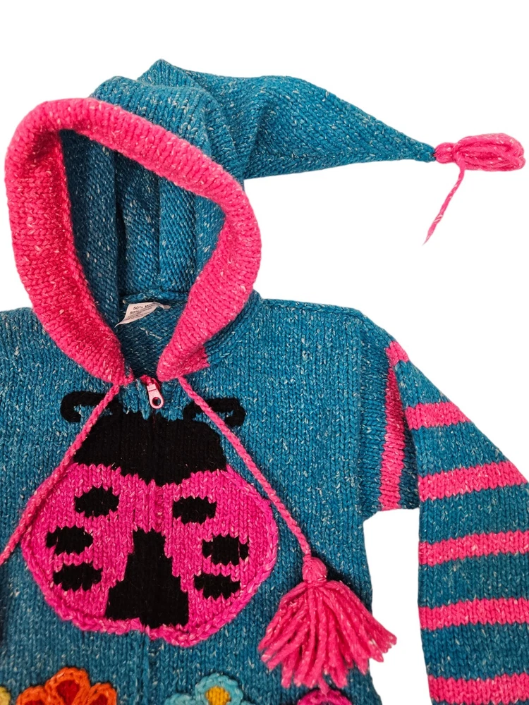 Janett'es Designs Handmade Wool Blend Full Zip Hooded Sweater Girls Small H50 In excellent condition Janett'es Designs Handmade Wool Blend Full Zip Hooded Sweater Girls Small. Features adorable colorful handmade wool blend ladybug sweater, full front zipper, hood with elf like extension and hot pink pom pom, hot pink ladybug knitted on front and back, drawstring hood with hot pink pom poms, charming floral design at bottom hem, long sleeve with stripes, unique shacket for your little girl. size small 6/8 Please review measurements as this is a handmade wool sweater and there is no size tag. Measurements laying flat chest 12.5" length 16" arm inseam 12.5" Fabric wool and cotton This is a pre-owned item that may show signs of wear. In excellent condition, no flaws.