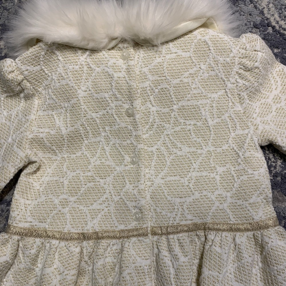 The Janie and Jack Girls 3T Ivory Gold Fit & Flare Dress is a stylish and elegant choice for your little one, perfect for special occasions like parties or formal events. The dress features a geometric pattern in gold, with a faux collar and puff sleeves for a sophisticated look. Made from polyester knit fabric, this knee-length dress is easy to care for with machine washable instructions. The dress is accented with fur trim, metallic thread, and button closures, making it a festive and charming option for your daughter's wardrobe, suitable for all seasons.