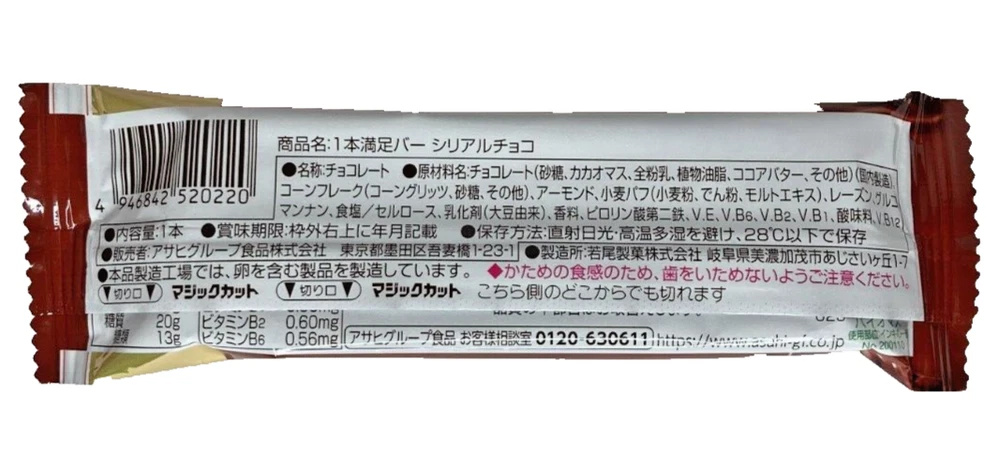 Regional Cuisine/Region: Japanese MPN: Does Not Apply Calories per 100 g/mL: 527 Kcal per 100g Item Weight: Approx. 333g Allergens: Wheat, Milkingredients, Almond, Soybeans gtin13: 4946842520220 Number of Servings: 9 Type: Chocolate Cereal Bar Brand: Asahi Group Foods Country/Region of Manufacture: Japan Food Specifications: Premium Cacao and Milk UPC: 4946842520220 Calories per Serving: 195 kcal per 37g piece Product: Chocolate Snack Expiration Date: More than 180 days Food Aisle: Pantry Serving Size: 1 piece/ 1 bag