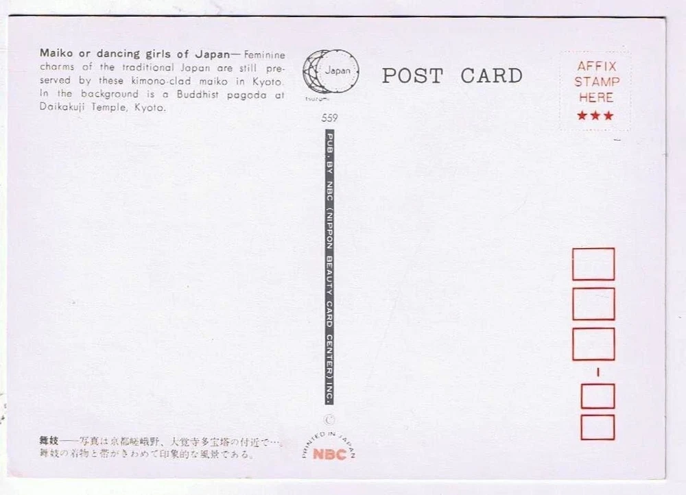 Japan Postcard Kyoto Maiko Dancing Girls Daikakuji Temple Buddhist Pagoda Japan Postcard Kyoto Maiko Dancing Girls Daikakuji Temple Buddhist Pagoda Very Good WE ANSWER ALL QUESTIONS WITHIN 2 BUSINESS DAYS. FOR AUCTION ITEMS, PLEASE DO NOT BID UNTIL WE HAVE RESPONDED TO YOUR QUESTION. PLEASE LOOK AT ALL PHOTOS AS THIS IS THE EXACT ITEM YOU ARE BIDDING ON OR PURCHASING. EXPECT ITEMS TO BE IN NORMAL VINTAGE USED CONDITION. WE TRY TO SPECIFY ALL FLAWS. IF THERE IS A PROBLEM WHEN YOU RECEIVE YOUR ITEM PLEASE CONTACT US BEFORE LEAVING FEEDBACK. Buyers outside USA and Canada, please contact seller for shipping and handling charges before bidding or purchasing. INTERNATIONAL BUYERS are responsible for paying all import duty, tax and fees which may be collected by your country when the parcel arrives. To avoid any misunderstanding, we declare the exact purchase price as the value of the goods when completing the customs declaration. We will NOT check the "gift" box or under-declare the value . Listing and template services provided by inkFrog