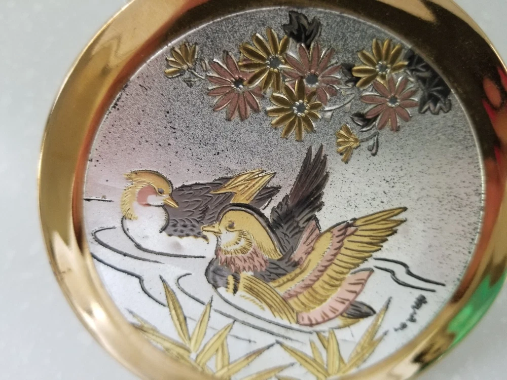 4" inch round collector trinket box with a white porcelain base featuring a decorative design of birds in the Japanese art of Chokin style. It is made in Japan and has intricate 24 Kt gold trim details. A beautiful piece of decorative collectible showcasing Japanese culture and craftsmanship. Very good preowned condition with no chips or cracks. Please view photos.