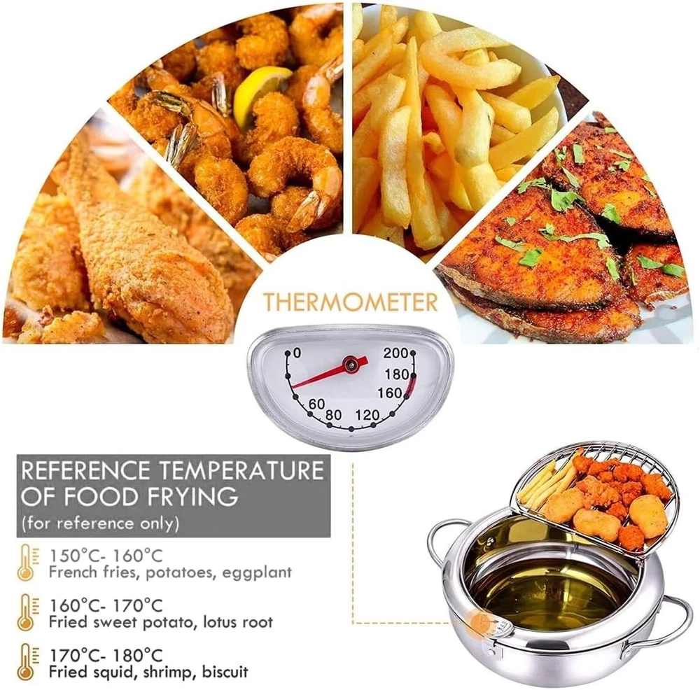 Brand: BeSAVAGE Model: Stainless Steel Deep Fryer Pot Material: Stainless Steel Features: Portable, Temperature Gauge, Lid And Oil Drip Rack, Stainless Ste, Temperature Control Item Height: 5.3 inch Item Width: 8.07 inch Color: stainless steel Oil Capacity: N/A Capacity: 2.2 L Item Depth: 8.07inch Voltage: N/A Power Source: Electric+Gas Type: Deep Fat Fryer Components Included: Pot