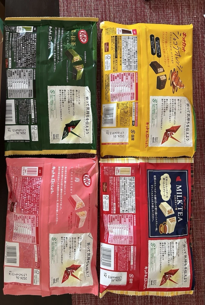 Japanese KitKat Assorted Flavors Set – Limited Edition Variety from Japan Perfect for Gifting, Snacking, or Collecting Unique Flavors! What’s Inside: Strawberry (苺) – 10 Mini Bars Sweet and creamy pink chocolate made with real strawberry powder, wrapped around crisp wafers. A fruity classic loved across Japan! Rich Matcha (濃い抹茶) – 10 Mini Bars Crafted with premium Uji matcha from Kyoto. A rich and earthy green tea experience with a perfect bittersweet balance, ideal for matcha lovers. Chocolate Orange (ショコラオレンジ) – 7 Mini Bars Zesty orange meets smooth chocolate! Inspired by European chocolate orange desserts, this is a refreshing and flavorful twist. Milk Tea Flavor – Let’s Have a Tea Party! – 7 Mini Bars Elegant milk tea-flavored white chocolate with black tea notes. Wrapped in adorable plaid packaging, this is a must-have for tea lovers! Why You’ll Love It: Authentic flavors only available in Japan Great for parties, events, or souvenirs Individually wrapped – perfect for sharing Beautiful, colorful packaging – ready to gift! Total: 34 mini bars (4 packs in total – assorted by flavor and count) Bring home a delicious piece of Japan’s snack culture with this colorful and flavorful KitKat collection! Great for gifting, collecting, or just treating yourself.