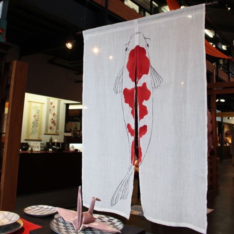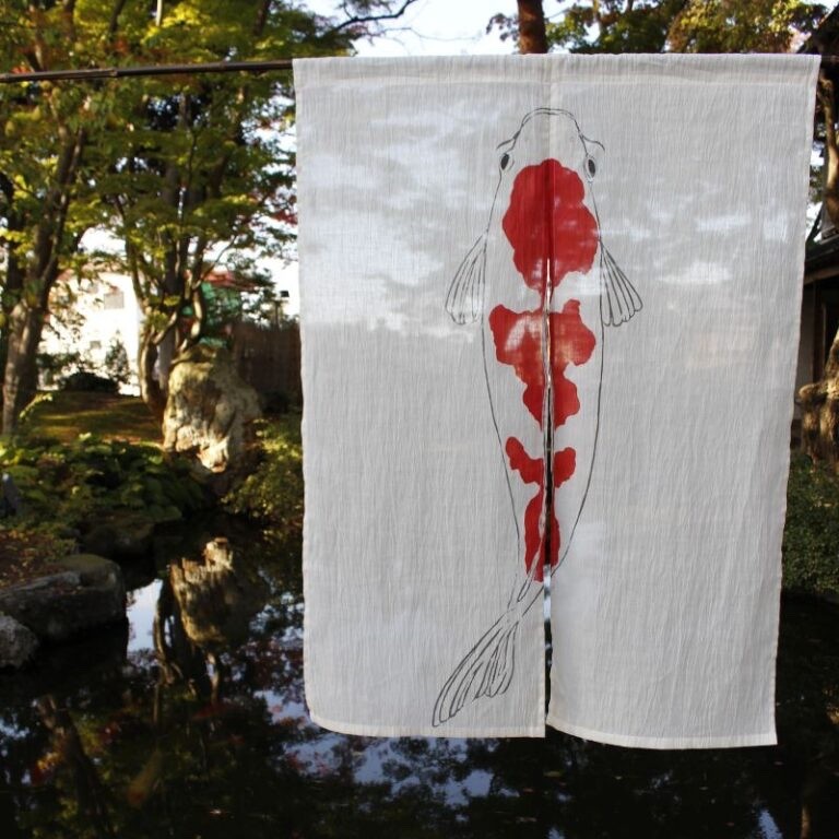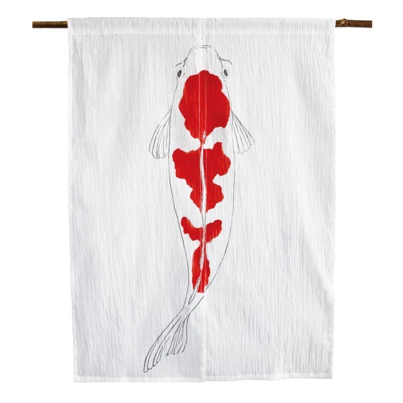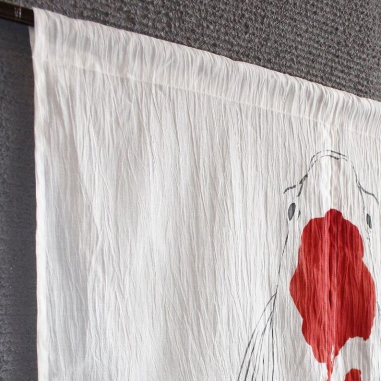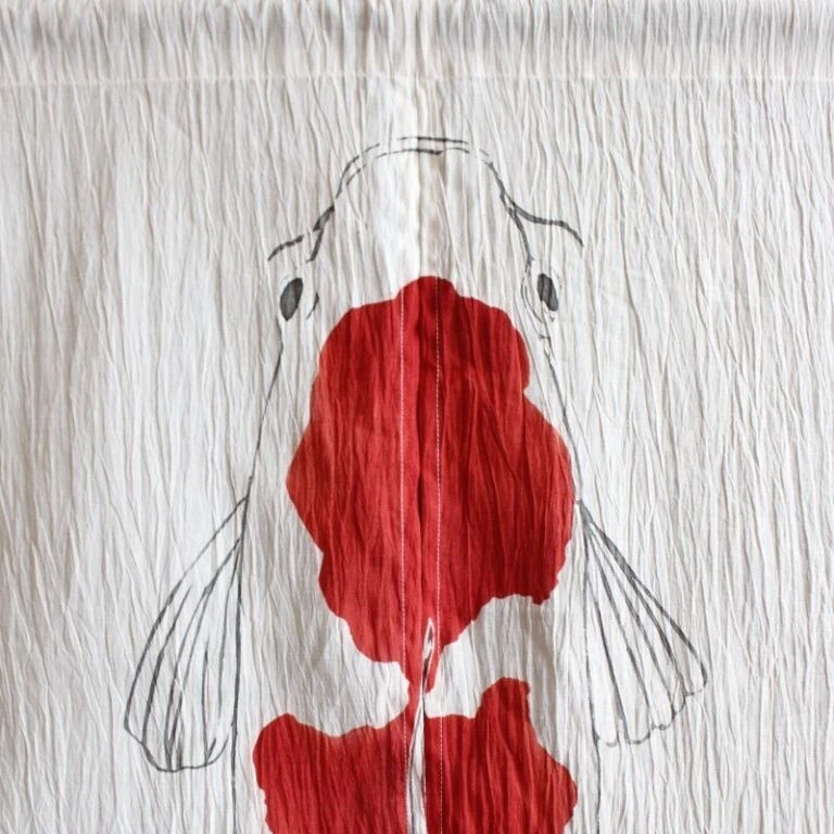 Japanese Linen Noren – Koi (Ojiya Chijimi) | Made in Japan A striking Japanese linen noren curtain featuring a bold Koi fish design. This piece is made in Ojiya City, Niigata Prefecture, a region closely associated with Nishikigoi (ornamental koi carp) and also famous for traditional textiles. The fabric is a unique textured linen called “Chijimi”, inspired by the historic craft textile Ojiya Chijimi. Through a traditional process known as “Yumomi” (hot-water kneading), artisans carefully rub and knead the cloth in warm water to create beautiful natural crinkles (shibo texture). Every step is done by hand, resulting in a refined, organic texture and an elegant presence. Perfect as a doorway curtain, room divider, wall hanging, or Japanese-style interior décor. Details Item: Japanese Noren curtain / room divider Design: Koi fish (Nishikigoi) Color: Natural off-white (Kinari) Material: 100% Linen (Ramie / Choma) Size: Approx. 84 cm (W) × 120 cm (L) Origin: Made in Japan (Ojiya, Niigata) Production: Handmade / traditional “Yumomi” textured fabric