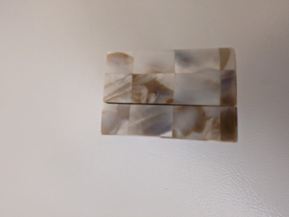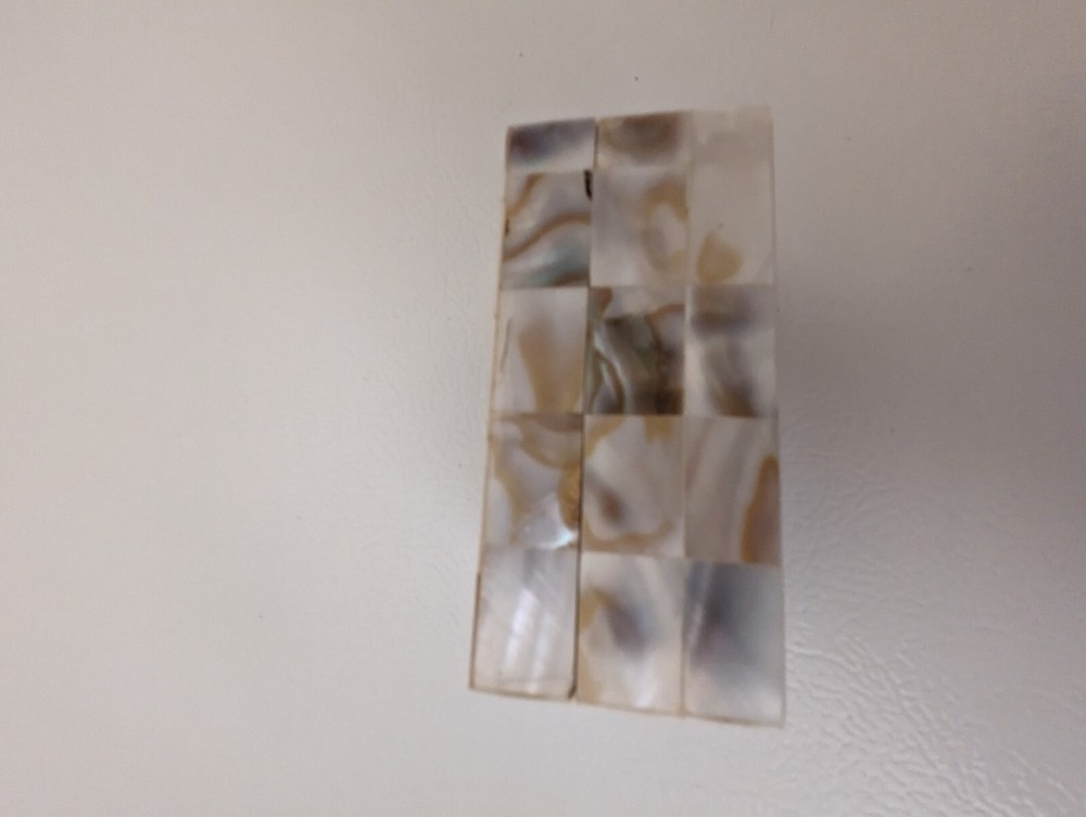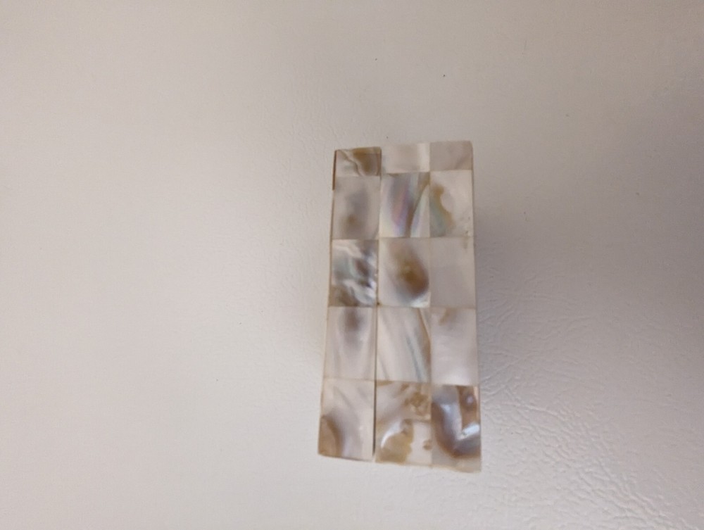Mother of pearl/wood trinket box made in Japan. 3 3/4" x 2 1/2" in used condition. Nice diamond design on lid and inside of box is in excellent condition. Slight flaws to mother of pearl on back of lid (pictures 5 and 9), please see pictures. Would make a good tooth box for a child to present to the Tooth Fairy. Questions, please don't hesitate to ask. Thank you.