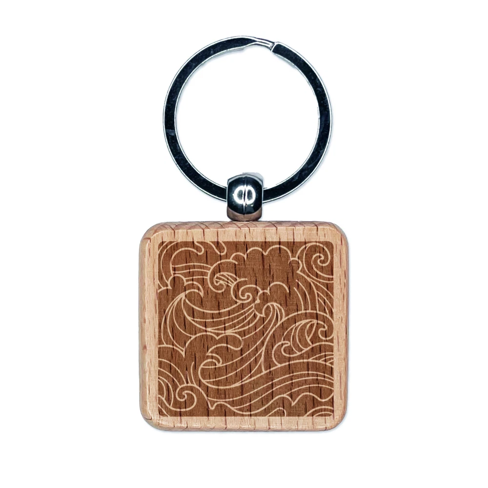Japanese Ocean Waves Engraved Wood Square Keychain Tag Charm