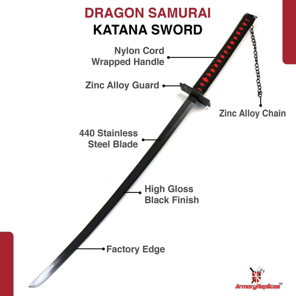 Black Katana With an overall length of 39 INCHES, a handle length of 11.5 INCHES, and a blade length of 27.5 INCHES, this foam katana strikes the ideal balance between authenticity and convenience, making it perfect for cosplay, theatre, and other events. Black Ninja Katana Standing at an overall length of 42.5 inches, with a 31.5-inch blade and a handle length of 11 inches, the sword showcases authentic proportions for a true Japanese Ninja Katana experience. The guard dimensions of 4 x 3 inches and an inner core of 10mm contribute to its realistic feel. Cosplay Katana-Black with Belt The pommel has a black chain decoration that measures, 75 inches long. Case Overall Length: 12.25 Inches, Case Material: Nylon Cosplay Katana-blue Measuring at 39 inches overall, with a handle length of 11.5 inches and a 27.5-inch blade, this foam katana perfectly replicates Hitsugaya's Hyorinmaru. Ideal for LARP, costume parties, cosplay events, theatre performances, and more. Real Katana-Black 68" Dive into the Details with Precision Specifications - an Overall Length of 68 Inches (in Scabbard), a 48-Inch Blade, and a 1.25-Inch Blade Width. The 3mm Thickness Guarantees Strength, While the 16-Inch Handle Adds Balance and Control to This Formidable Katana. Real Katana-Blue 41" Experience the traditional Japanese craftsmanship with a heat-tempered 28.5-inch blade showcasing an authentic Hamon, created using a fast cooling method. The Hi or Blood Groove adds balance and maneuverability. Real Katana-White 38" Measuring at 38 inches overall, with a 26.25-inch carbon steel blade and an 11.75-inch handle, our katana is designed exclusively for decorative and display purposes, featuring a Manji Guard for added aesthetic appeal. Real Katana-White Snow 41" Measuring 41 inches overall with a 26-inch blade, 15-inch handle, and featuring intricate details, this decorative katana is ideal for showcasing your love for anime, making it a must-have for collectors and fans alike. Real Katana-white 40.75" With an overall length of 40.75 inches, a 26-inch blade, and a handle length of 14.75 inches, this replica katana boasts a substantial presence. The 3.75mm blade thickness ensures durability, making it a standout addition for enthusiasts and collectors alike. Real Steel Katana-Black 40" Whether you're a collector or attending conventions, this katana is a must-have. With an overall length of 40 inches and a high-gloss black blade, it's not just a sword ? it's a statement piece that resonates with millennial style. Plus, it comes complete with a hardwood sheath for convenient storage and transport. White Katana With an overall length of 39.25 inches, a handle length of 11.75 inches, and a 27.5-inch blade, our foam katana mirrors the proportions of the anime original, offering a striking visual impact at conventions and gatherings.