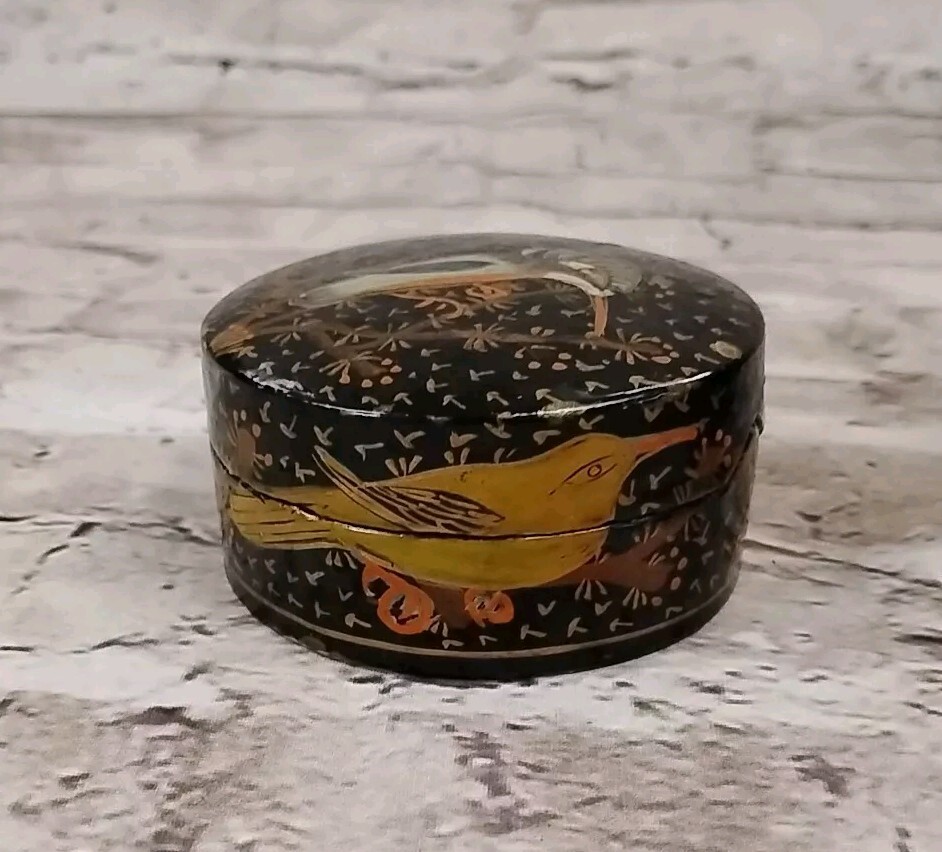 This beautifully crafted trinket box is a must-have for collectors of all things decorative. The round shape and lacquered finish give it a unique and elegant look that is sure to catch the eye. The box features a stunning bird design, perfect for those who love boxing or any other sport. It comes boxed and is ready for display or use. The brand is Bird and it is made of high-quality materials, ensuring its durability. This trinket box is a great addition to any collection and is sure to be a conversation starter.