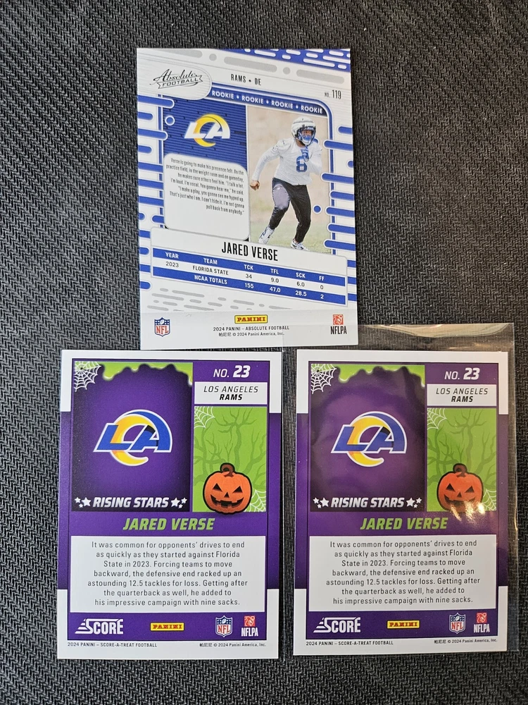 The product is a lot of 3 Jared Verse 2024 rookie sports trading cards featuring him as a player for the Los Angeles Rams in the 2024 NFL season. The cards are part of the 2024 Score and 2024 Absolute sets manufactured by Panini. These trading cards are a great addition for fans and collectors of football memorabilia.