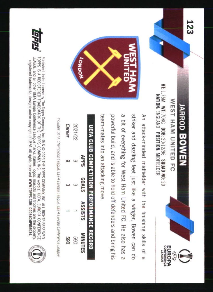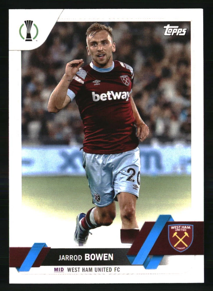 Player|Athlete: Jarrod Bowen Year Manufactured: 2022 Card Number: 123 Set: 2022-23 Topps UEFA Club Competitions Season: 2022 Autographed: No Manufacturer: Topps Sport: SOCCER Type: Sports Trading Card Graded: No Team: West Ham United