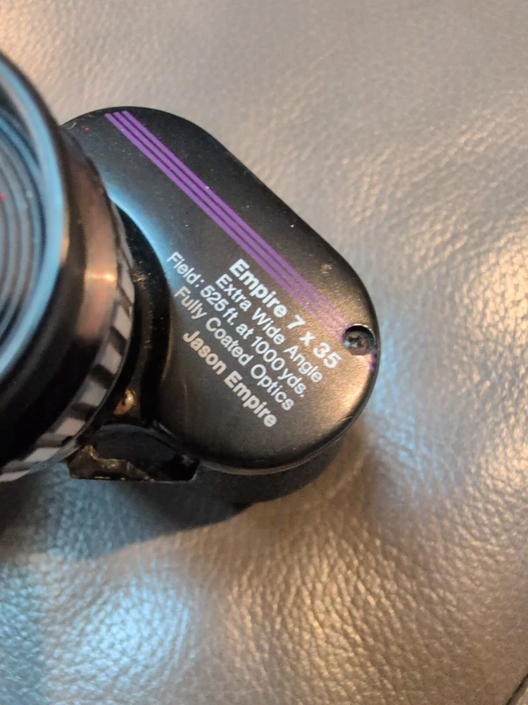 Jason Empire Binoculars, model 266F. Perfect for birding, hunting, or simply enjoying the marine environment, these binoculars offer a 7x magnification and an objective lens diameter of 35mm. Offers extra-wide angle and fast focus features. Made in Hong Kong. Pre-owned and in good condition (on outside body) but can't still see great images. See pictures for worn areas.