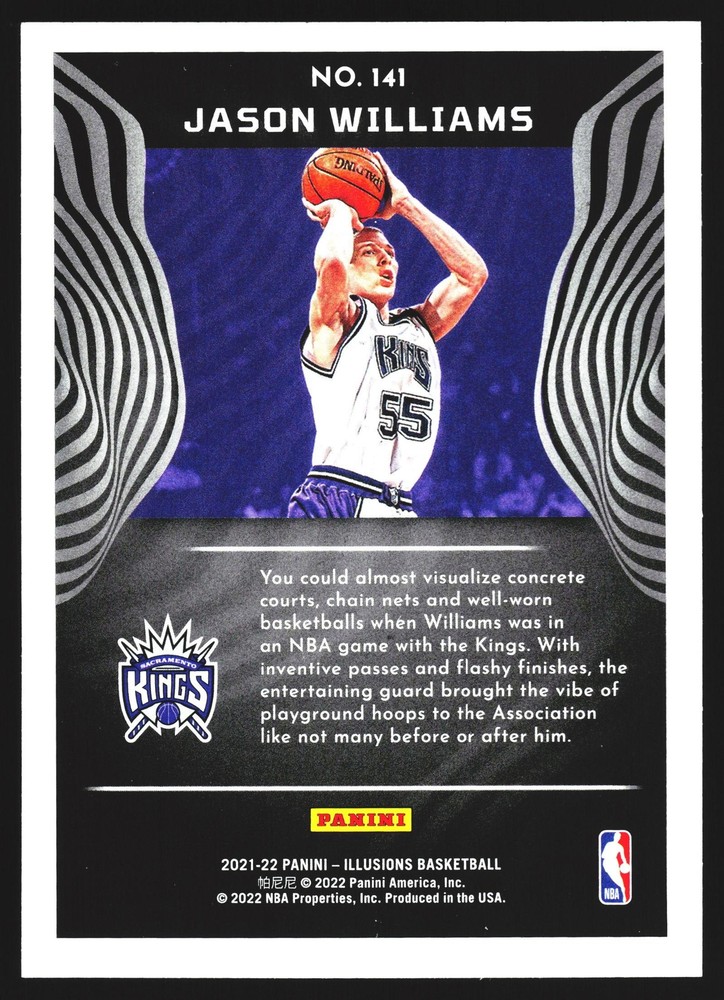 Manufacturer: Panini Player/Athlete: Jason Williams Card Number: 141 Set: 2021-22 Panini Illusions Country/Region of Manufacture: Unknown Material: Card Stock, Paper, Paperboard Sport: Basketball Team: Sacramento Kings Graded: No Autographed: No Season: 2021 Card Size: Standard League: NBA, National Basketball Association (NBA) Year Manufactured: 2021 Type: Sports Trading Card