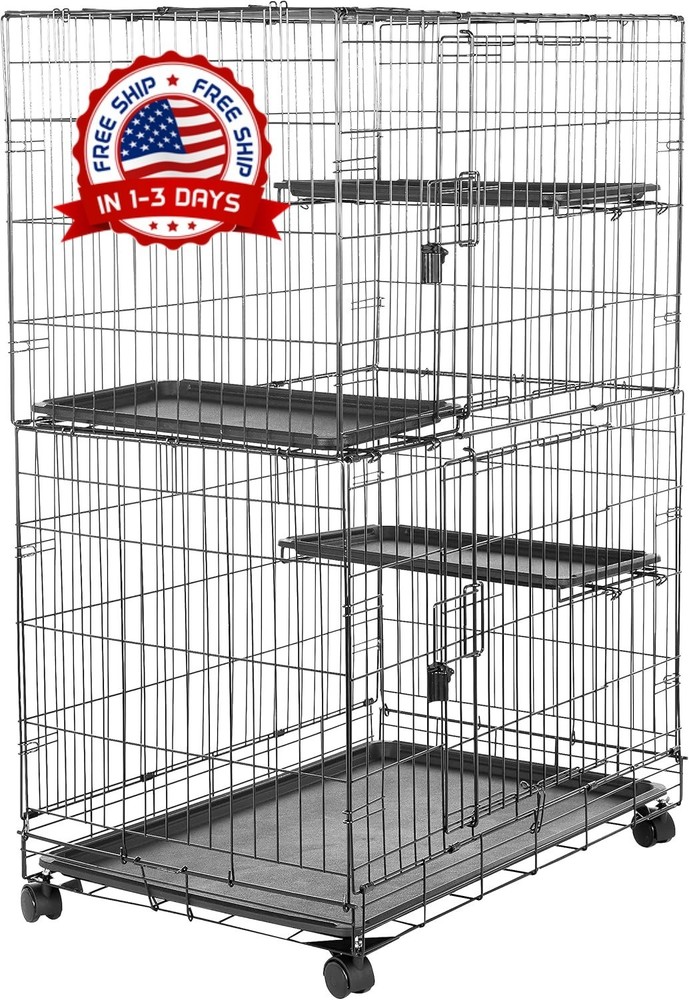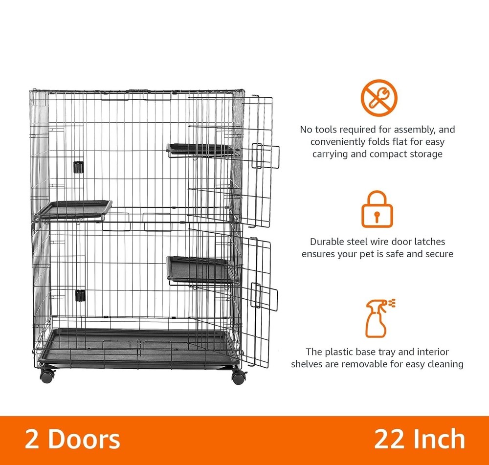 Jaula alta para gatos de 3 niveles para interiores que ofrece a gatos o gatitos un lugar seguro para descansar o jugar. Construcción duradera de alambre de acero resistente a la oxidación con pestillos de seguridad en la puerta y 3,4 cm de espacio entre las barras para mayor seguridad. Se monta rápidamente; 4 ruedas con bloqueo para maniobrar con suavidad y colocarlo de forma segura; se pliega completamente para facilitar su transporte y un almacenamiento compacto. 2 puertas abatibles para facilitar el acceso interior superior e inferior; 3 estantes interiores ofrecen espacio vertical para posarse o echarse una siesta; Base de plástico extraíble a prueba de fugas para una limpieza fácil. Dimensiones del producto: 90 x 57 x 127 cm (largo x ancho x alto).