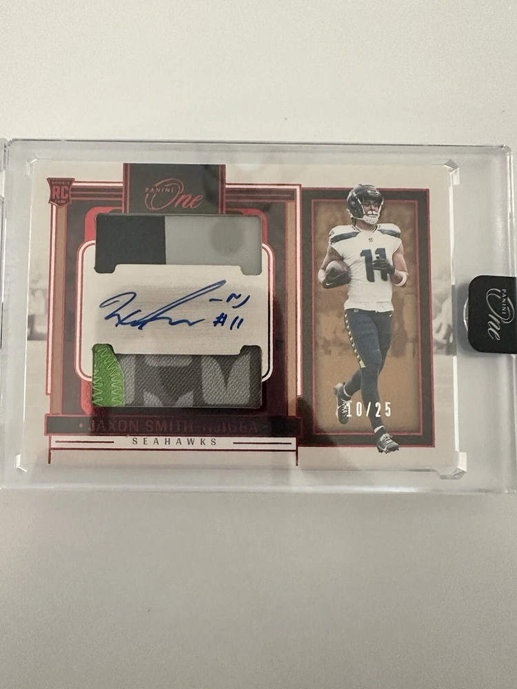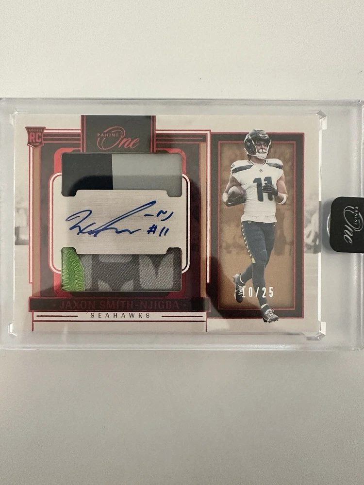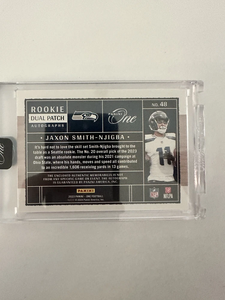 Autographed: Yes Features: Memorabilia, Parallel/Variety, Rookie, Serial Numbered, Short Print, Exclusive, Framed, Insert Parallel/Variety: Red Type: Sports Trading Card Season: 2023 Manufacturer: Panini Autograph Authentication: Panini Authentic Team: Seattle Seahawks Player/Athlete: Jaxon Smith-Njigba Signed By: Jaxon Smith-Njigba Sport: Football Card Number: 48 Print Run: 25 Card Name: Rookie Dual Patch Auto Year Manufactured: 2023 League: National Football League (NFL) Set: 2023 Panini One
