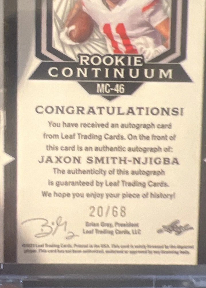For the avid collector of sports trading cards, this Jaxon Smith-Njigba Leaf Continuum card is a must-have. Featuring an authentic autograph from the Seattle Seahawks and Ohio State Buckeyes player, this 2020 Leaf card is a rare find with a limited print run of only 68. The card is serial numbered and certified by Leaf, ensuring its authenticity as a rookie card. This Gold parallel/variety card is not only a great addition to any collection, but also an excellent investment opportunity. As a short print card, it is sure to be a sought-after item among sports trading card enthusiasts. Don't miss out on the chance to own a piece of football history with this Jaxon Smith-Njigba Leaf Continuum card.