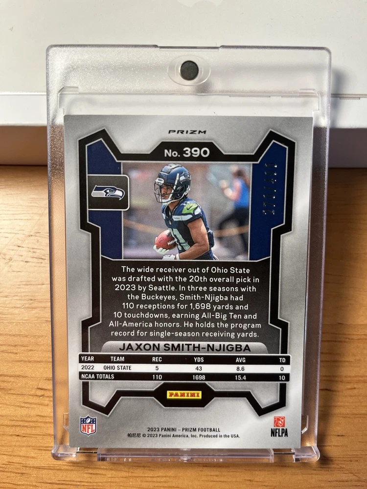 Player/Athlete:Jaxon Smith-NjigbaAutographed:NoFeatures:Rookie, Serial Numbered, Parallel/Variety, Short Print, HologramTeam:Seattle SeahawksManufacturer:PaniniPrint Run:400Parallel/Variety:Silver MojoLeague:National Football League (NFL)Type:Sports Trading CardSport:FootballSeason:2023Set:2023 Panini PrizmCard Number:390