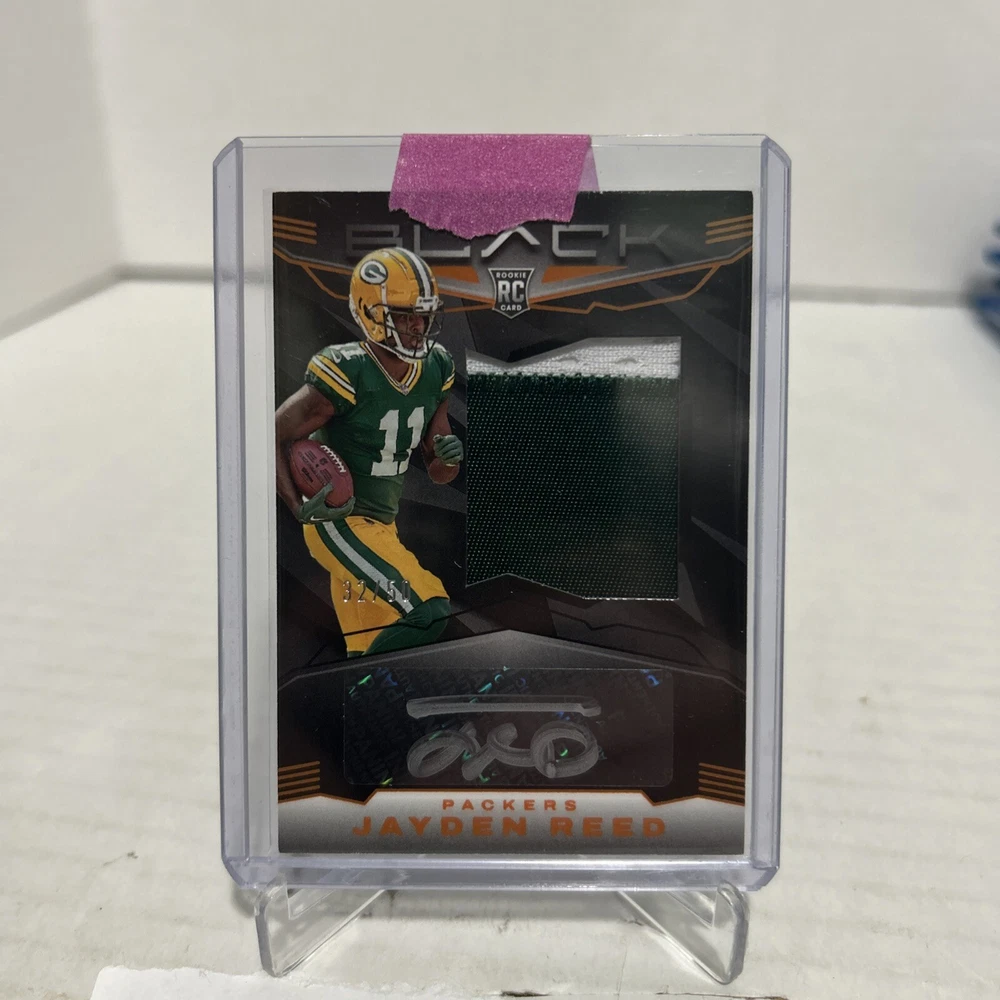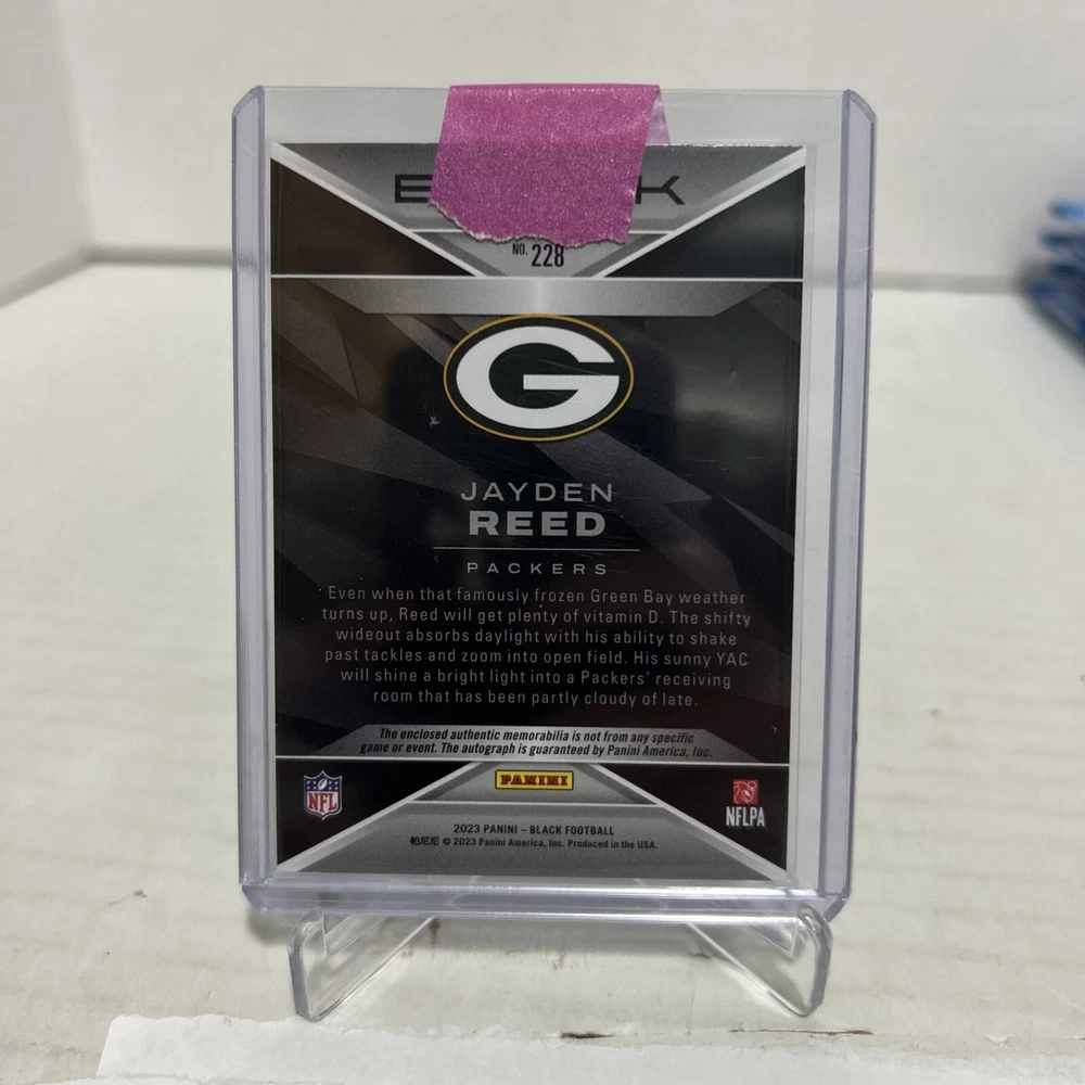 Elevate your collection with the Jayden Reed 2023 Panini Black SP Citrine Rookie Patch Auto /50 RC RPA #228, an exceptional piece of sports memorabilia. This limited edition card features a stunning two-color patch, silver ink autograph, and is serial numbered, making it one of only 50 in existence. As a collector's edition and first edition item, it boasts the prestige of being a chase card and a short print from the 2023 Panini Black Football set. Representing the Green Bay Packers and Michigan State Spartans, this card is a testament to Jayden Reed's athletic prowess and potential. Authenticated by Panini Authentic and presented in ungraded condition, this card is a must-have for fans of the National Football League and collectors of exclusive sports trading cards.
