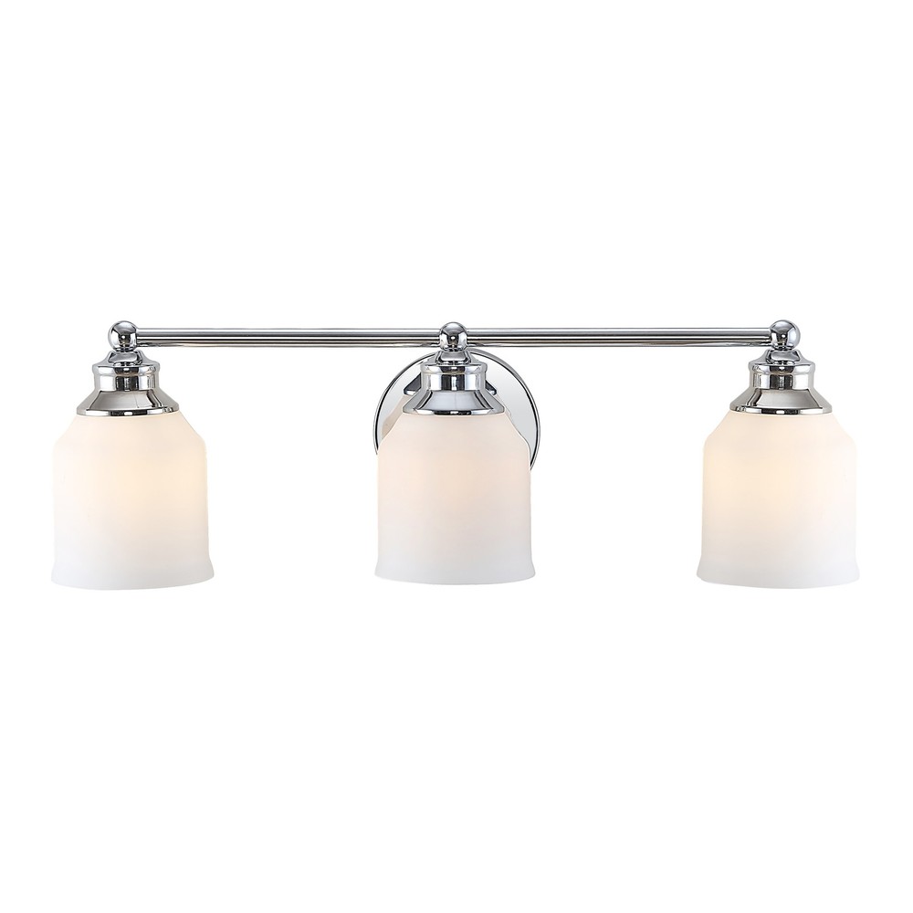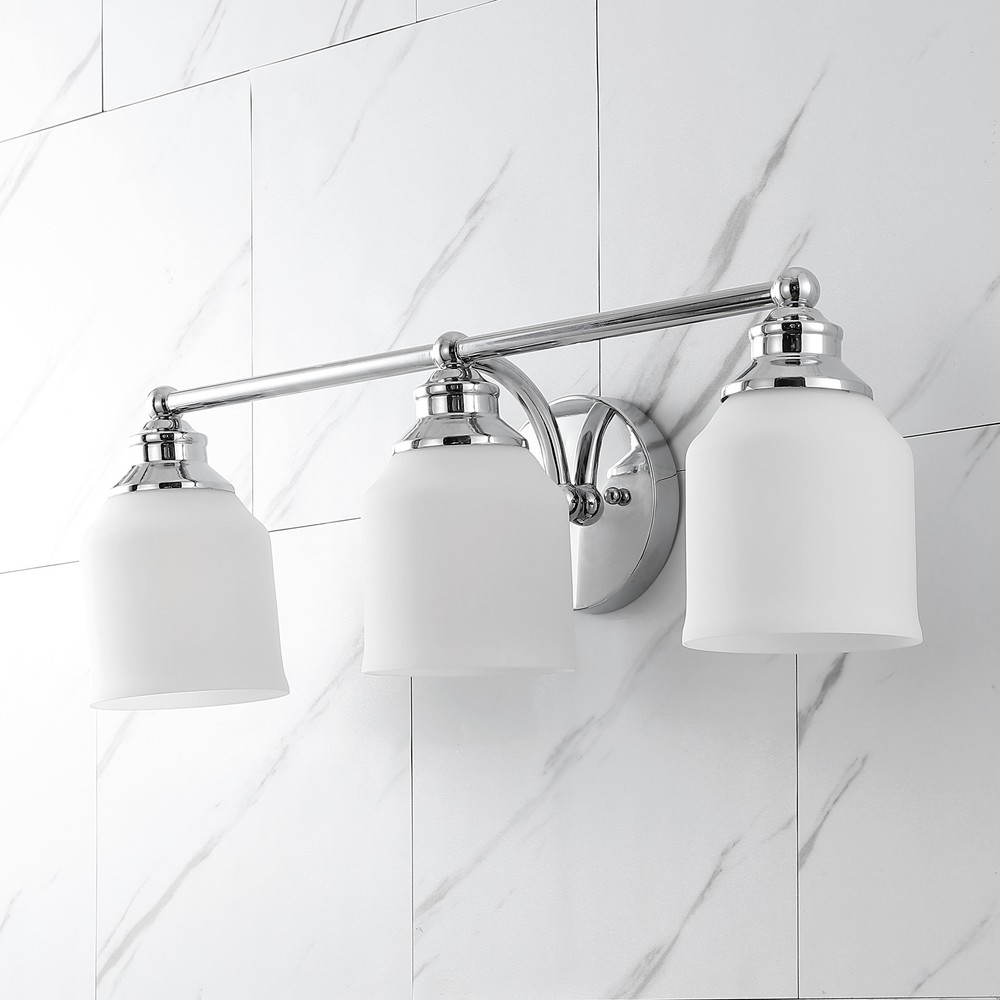 Elevate your urban apartment, cottage or farmhouse with our versatile take on a classic wall light. The included LED bulb casts a warm glow, providing plenty of light. The frosted glass bell shade and sparkling chrome finish add elegant vintage style to your bath vanity, or above a kitchen sink. Features:Replace outdated wall sconces or vanity lights with this sparkling chrome classic for an instant style makeoverOur light fixtures work with LED-compatible dimmers; professional installation is recommendedEco-Friendly 4W LED Bulb includedbulbs compatible with an 9W LED or 40W TYPE "A"or 13W CFLColor Temperature: 2700KColor: Chrome with white shadeBody Material: Iron/GlassIncludes: One (1) lampAssembly Required About us:You see a lamp.We see a decorative work of art.A perfectly curved shade Free Shipping Over $49.99* Details Jayne Iron/Frosted Glass Farmhouse Cottage LED Vanity Light, by JONATHAN Y Product Description: Elevate your urban apartment, cottage or farmhouse with our versatile take on a classic wall light. The included LED bulb casts a warm glow, providing plenty of light. The frosted glass bell shade and sparkling chrome finish add elegant vintage style to your bath vanity, or above a kitchen sink. Features: Replace outdated wall sconces or vanity lights with this sparkling chrome classic for an instant style makeover Our light fixtures work with LED-compatible dimmers; professional installation is recommended Eco-Friendly 4W LED Bulb included bulbs compatible with an 9W LED or 40W TYPE "A"or 13W CFL Color Temperature2700K ColorChrome with white shade Body MaterialIron/Glass IncludesOne (1) lamp Assembly Required About us: You see a lamp. We see a decorative work of art. A perfectly curved shade casts a dramatic shadow on a floor. Compatible with LED lightbulbsas easy on the environment as they are on the eyes. The JONATHAN Y Lighting collection considers every detail from impeccably sourced materials to designer styling. And our prices are so attractive, we’ve transformed a functional necessity into a fashion accessory. JONATHAN Y Lighting - a fashion revolution in home decor.