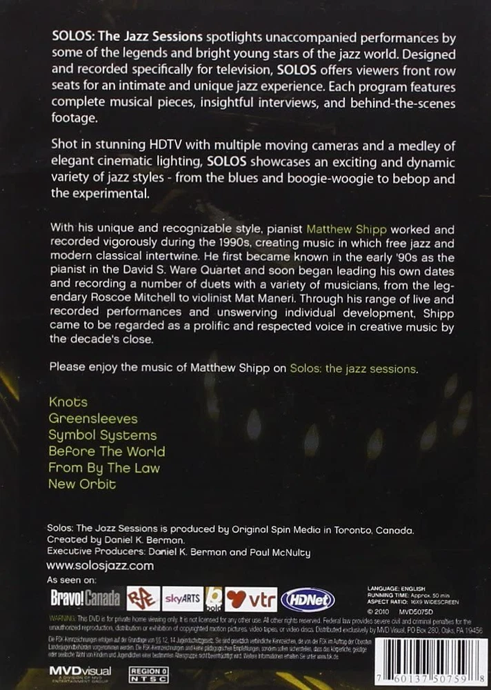 Further Details Title: Jazz Sessions - Matthew Shipp Format: DVD Condition: New Number Of Discs: 1 Release Date: 01/10/2011 Audio Language: English Runtime: 50 minutes Region Code: DVD: 2 (Europe, Japan, Middle East...) Studio: Wienerworld Description: SOLOS: the jazz sessions is a 39 part television music profile/performance series. Each episode features complete musical pieces, interviews and behind-the-scenes footage with some of today's most notable jazz artists. Shot in HDTV with multiple moving cameras and a medley of elegant, cinematic lighting designs, SOLOS: the jazz sessions showcases an exciting and dynamic variety of jazz styles from the blues and boogie-woogie to bebop and beyond. With his unique and recognizable style, pianist Matthew Shipp worked and recorded vigorously during the 1990s, creating music in which free jazz and modern classical intertwine. He first became known in the early '90s as the pianist in the David S. Ware Quartet, and soon began leading his own dates - most often including Ware bandmate, leading bassist William Parker - and recording a number of duets with a variety of musicians, from the legendary Roscoe Mitchell to violinist Mat Maneri, who began appearing on recordings in the 1990s. Through his range of live and recorded performances, and unswerving individual development, Shipp came to be regarded as a prolific and respected voice in creative music by the decade's close. DVDs ARE REGION 1 UNLESS OTHERWISE STATED Missing Information? Please contact us if any details are missing and where possible we will add the information to our listing.