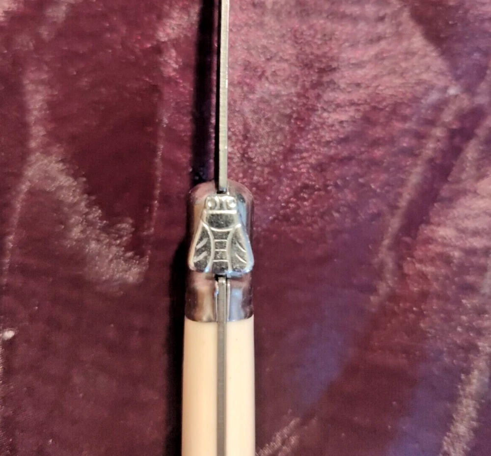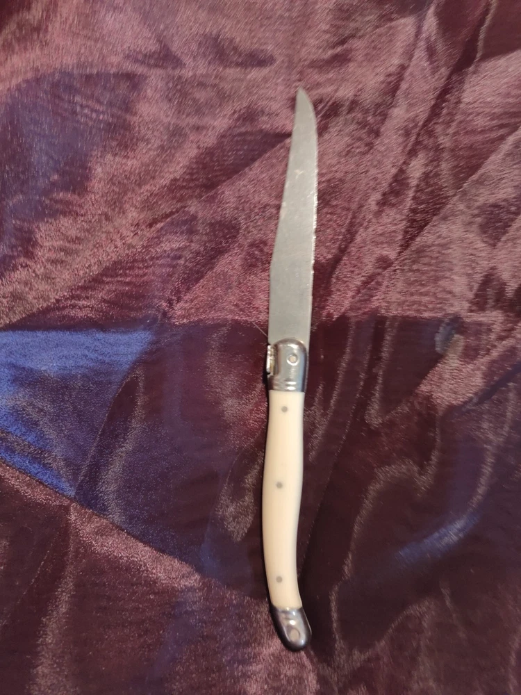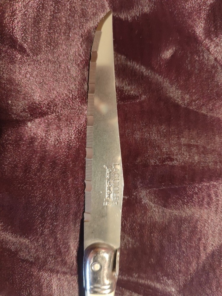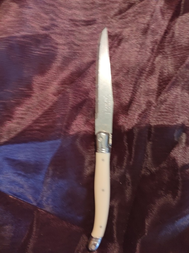 The Jean Dubost Laguiole Replacement Steak Knife in Ivory color with a silver bee emblem between the blade and handle is a high-quality utensil made in France. The Laguiole brand is known for its craftsmanship and attention to detail, making this knife a reliable choice for any kitchen looking to replace or add to your current set. The knife is preowned, and it does show wear from use including scratches, scrapes and buffs to the blade and handle.