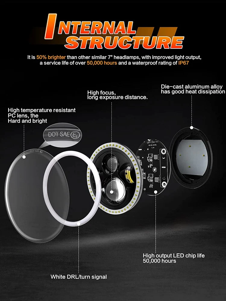Package list: 2PCS 7 Inch 100W LED Round Headlights 2PCS 4 Inch Fog Lights 2PCS Smoked Turn Signal Lamp (6pcs total) Description: *Newest LED Projector Headlights, 7 inch 105W round led headlights with 8000LM high beam and 4800LM low beam at 6000K for each headlight, above 80000 hours lifespan. *High quality chip LED Fog light provide extra great light to help you driving safely on hard road or bad weather! *LED Turn signal light applies smoked materials, a premium material of gloss finish, instead of frosted glass to create a sense of luxury and secrecy. *Easy to installtion, plug & play.DOT Approved. Specifications: 7\\\\'\\\\' 105W LED Round Headlight: * LED Color: 6000K-6500K White * Luminous Flux: 8000 Lumen High Beam / 4800 Lumen Low Beam * Headlight Type: High/Low Beam(white) / DRL(white) / Turn Signal(red) * Power: 100W/PC * Size: 7\\\\'\\\\' inch * Color: Black * Material: Diecast Aluminum Housing+pc * Voltage: DC 9V~32V * Lifespan: More than 80,000hours. 4\\\\'\\\\' Fog Lights: *LED Color: 6000K White *Power: 60W/PC *Voltage: DC 9V~16V *Luminous Flux: 4000 Lumens/PC *Waterproof: IP67 *Size: 4\\\\'\\\\' Inch Foglight *Color: Black *Material: Aluminum die cast housing+pc Turn Signal Lights: *Item Type: LED Turning Light *LED Color: 2000K(Yellow) *Size: 8.8*8.8*7.2cm *Color: Smoked Lens *Material: Durable ABS Plastic *Voltage: DC9-16V *Lifespan: More than 80,000hours. Warranty: 5 years Fitment: Fit For Jeep Wrangler JK JKU 2007-2018