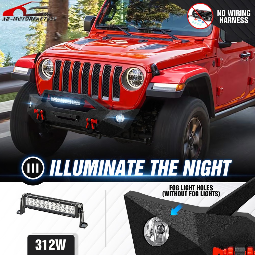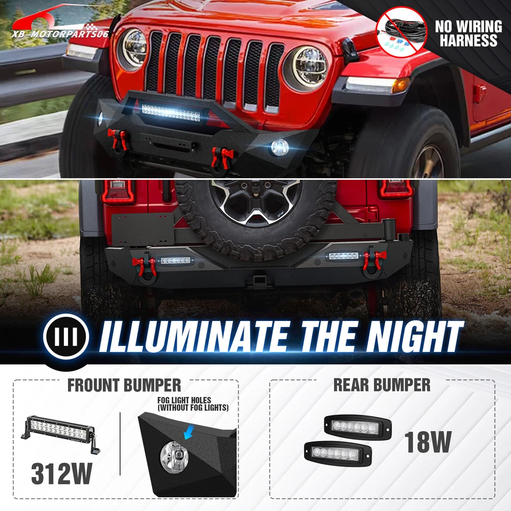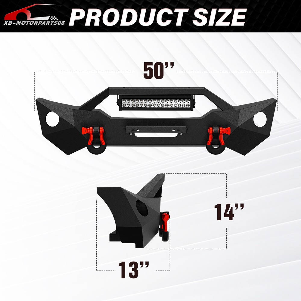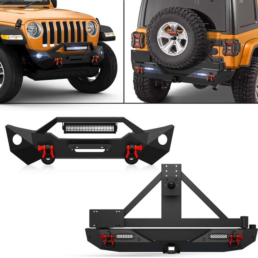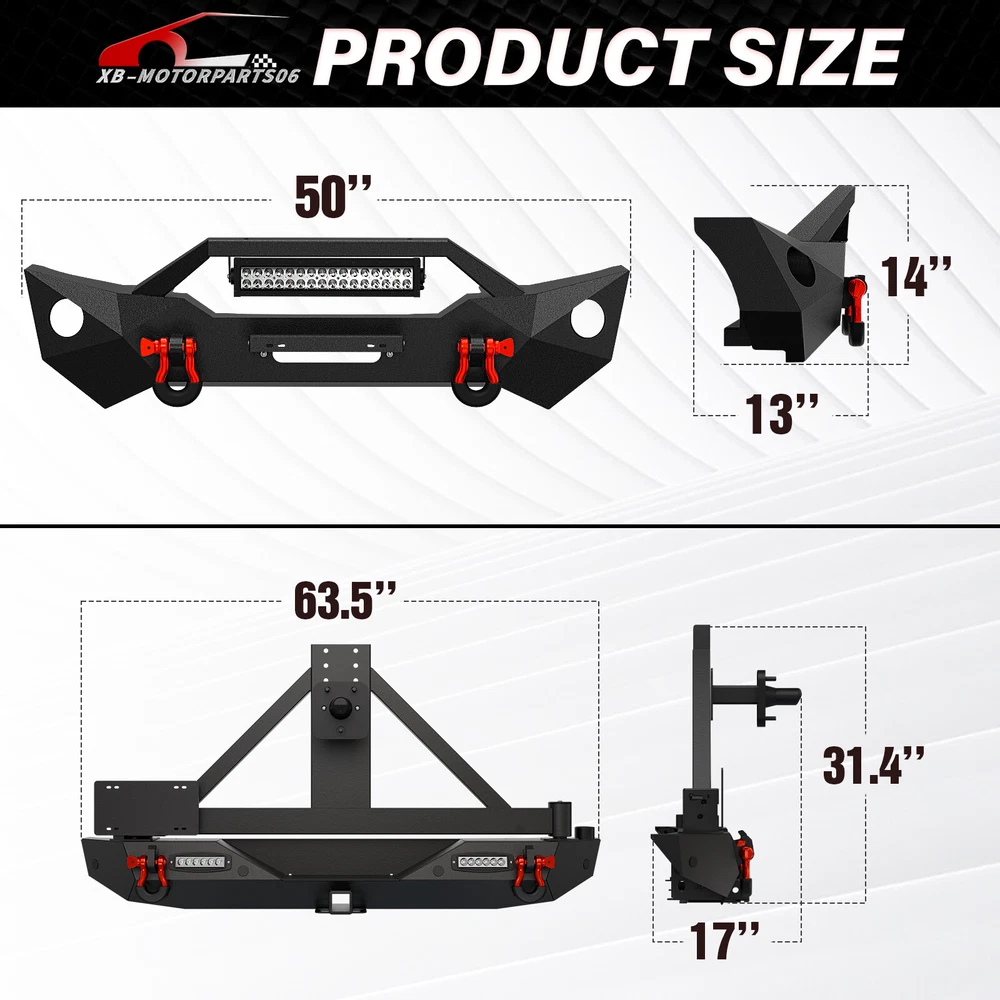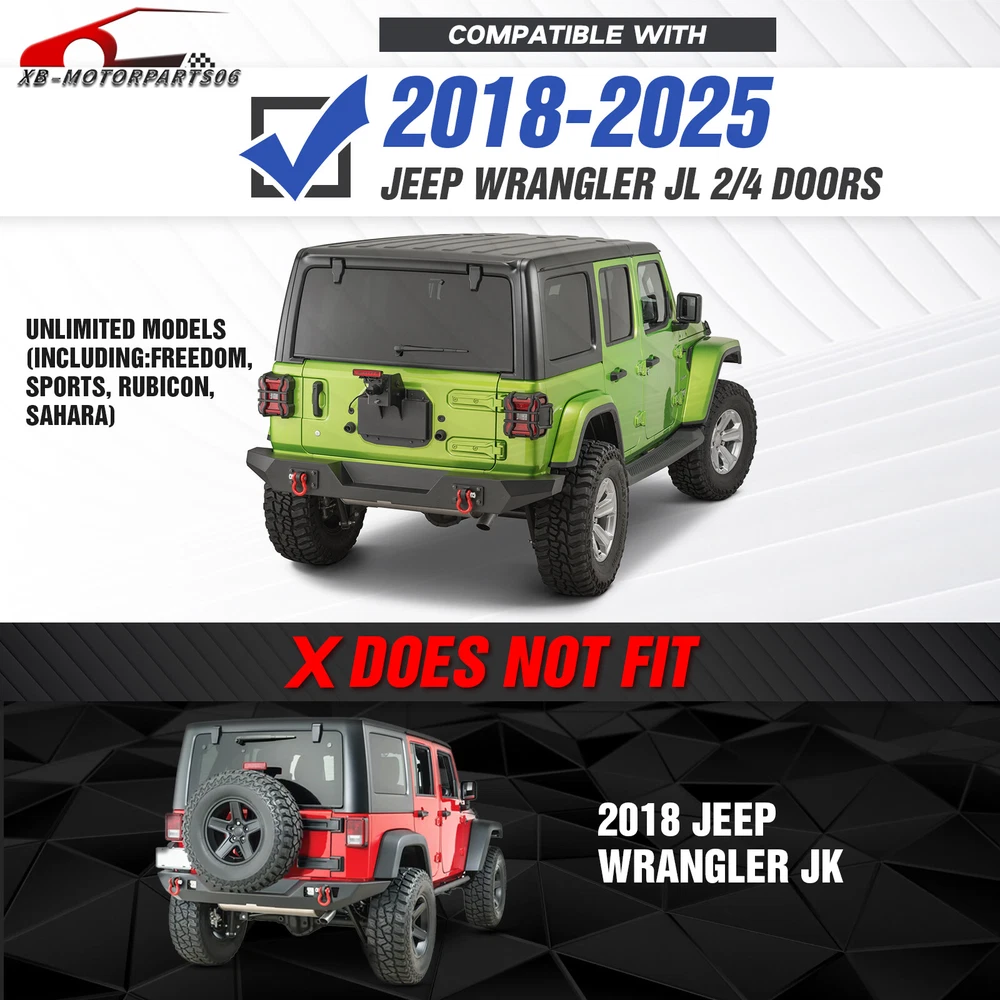 W/ License Plate Bracket Rear Or Front Bumper For 2018-2025 Jeep Wrangler JL JLU Please pay attention to the product options you select: If you choose Front & Rear Bumper,You can get 1 × Front Bumper, 1 × Rear Bumper and Mounting Hardware; If you choose Only Front Bumper,You can get 1 × Front Bumper and Mounting Hardware; If you choose Only Rear Bumper,You can get 1 × Rear Bumper and Mounting Hardware; Suitable Models : Compatible with 2018 2019 2020 2021 2022 2023 2024 2025 Jeep Wrangler JL JLU Unlimited Package Includes : ① Front & Rear Bumper option : 1 x Front Bumper, 1 x Rear Bumper, 7 x LED Lights, 1 x License Plate Bracket , 1 x 2" Hitch Receiver , 1 x Spare Tire Carrier, 1 x Winch Plate , 4 x D-rings, Paintable Armor, 2 x manual, screw fittings ② Fro nt Bumper option : 1 x Front Bumper, 1 x License Plate Bracket, 1 x Winch Plate, 1 x LED Lights, 2 x D-rings, 1 x manual, screw fittings ③ Rear Bumper option : 1 x Rear Bumper, 1 x 2" Hitch Receiver, 1 x License Plate Bracket, 1 x Spare Tire Carrier, 2 x LED Lights, 2 x D-rings, 1 x manual, screw fittings Product Information : Package Dimensions : 65.35"D x 26.38"W x 14.17"H Installation mode: Bolt-On With Sensor Holes: Yes ( Only Rear Bumper Have, and NOT f it for original sensor ) Steel thickness: 3mm Placement on Vehicle: Front/Rear Item Weight: Front Bumper: 70 Pounds; Rear Bumper: 121 Pounds Material: Carbon Steel Color: Black (hand measurements may have an error of 2-3 mm/0.078-0.118 in) Feature : Front bumper : ① The front bumper is furnished with a 12,000 lbs winch plate, accompanied by two 4.75-ton D-rings. It features an 312W LED spotlight and two factory-style fog light openings (fog lights not included). Additionally, it is equipped with a license plate bracket for added convenience; ② Durable front bumper constructed from sturdy steel, providing exceptional strength. The textured black powder coating effectively prevents rust, guaranteeing long-lasting performance and a sustained, stylish appearance; ③ The package includes all essential mounting hardware and user-friendly installation instructions, ensuring a straightforward and secure attachment without the need for any drilling; ④ Powder Coated, Durability, Waterproof; Rear Bumper : ① The bumper is equipped with an external swing-out spare tire carrier that can hold tires as large as 37 inches. The updated connectors have been redesigned to provide a secure locking mechanism, eradicating worries about the tire carrier becoming dislodged during off-road excursions; ② the spare tire carrier features a Rear View Camera Slot, allowing for easy integration of a rearview camera to enhance visibility and safety while maneuvering; ③ Our bumper features robust dual D-ring shackle mounts with a 9500lbs. rating, along with 2X enhanced LED lights, a license plate bracket, sensor holes and a standard 2" receiver hitch; ④ Powder Coated, Durability, Waterproof; Warranty Period :2 year Standard Shipping (FedEx Ground or FedEx Home Delivery) Will usually ship within 3 business days of receiving cleared payment Please pay attention to the product options you select: If you choose Front & Rear Bumper,You can get 1 × Front Bumper, 1 × Rear Bumper and Mounting Hardware; If you choose Only Front Bumper,You can get 1 × Front Bumper and Mounting Hardware; If you choose Only Rear Bumper,You can get 1 × Rear Bumper and Mounting Hardware; Suitable Models : Compatible with 2018 2019 2020 2021 2022 2023 2024 2025 Jeep Wrangler JL JLU Unlimited Package Includes : ① Front & Rear Bumper option : 1 x Front Bumper, 1 x Rear Bumper, 7 x LED Lights, 1 x License Plate Bracket , 1 x 2" Hitch Receiver , 1 x Spare Tire Carrier, 1 x Winch Plate , 4 x D-rings, Paintable Armor, 2 x manual, screw fittings ② Fro nt Bumper option : 1 x Front Bumper, 1 x License Plate Bracket, 1 x Winch Plate, 1 x LED Lights, 2 x D-rings, 1 x manual, screw fittings ③ Rear Bumper option : 1 x Rear Bumper, 1 x 2" Hitch Receiver, 1 x License Plate Bracket, 1 x Spare Tire Carrier, 2 x LED Lights, 2 x D-rings, 1 x manual, screw fittings Product Information : Package Dimensions : 65.35"D x 26.38"W x 14.17"H Installation mode: Bolt-On With Sensor Holes: Yes ( Only Rear Bumper Have, and NOT f it for original sensor ) Steel thickness: 3mm Placement on Vehicle: Front/Rear Item Weight: Front Bumper: 70 Pounds; Rear Bumper: 121 Pounds Material: Carbon Steel Color: Black (hand measurements may have an error of 2-3 mm/0.078-0.118 in) Feature : Front bumper : ① The front bumper is furnished with a 12,000 lbs winch plate, accompanied by two 4.75-ton D-rings. It features an 312W LED spotlight and two factory-style fog light openings (fog lights not included). Additionally, it is equipped with a license plate bracket for added convenience; ② Durable front bumper constructed from sturdy steel, providing exceptional strength. The textured black powder coating effectively prevents rust, guaranteeing long-lasting performance and a sustained, stylish appearance; ③ The package includes all essential mounting hardware and user-friendly installation instructions, ensuring a straightforward and secure attachment without the need for any drilling; ④ Powder Coated, Durability, Waterproof; Rear Bumper : ① The bumper is equipped with an external swing-out spare tire carrier that can hold tires as large as 37 inches. The updated connectors have been redesigned to provide a secure locking mechanism, eradicating worries about the tire carrier becoming dislodged during off-road excursions; ② the spare tire carrier features a Rear View Camera Slot, allowing for easy integration of a rearview camera to enhance visibility and safety while maneuvering; ③ Our bumper features robust dual D-ring shackle mounts with a 9500lbs. rating, along with 2X enhanced LED lights, a license plate bracket, sensor holes and a standard 2" receiver hitch; ④ Powder Coated, Durability, Waterproof; Warranty Period :2 year