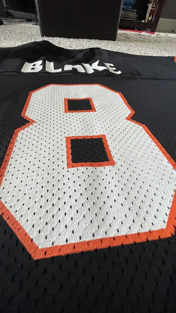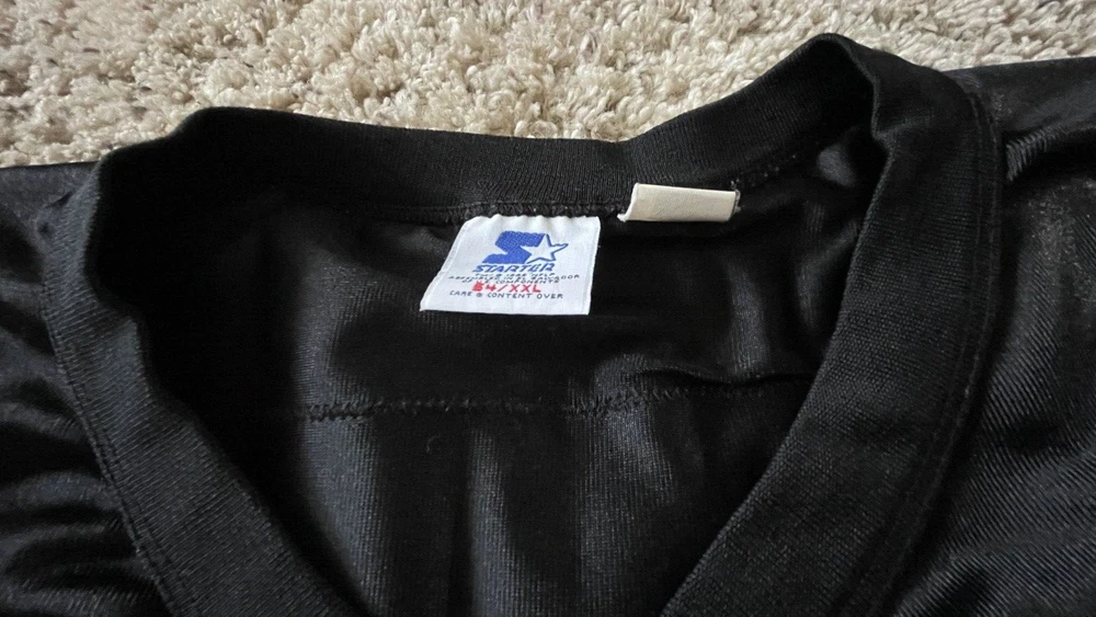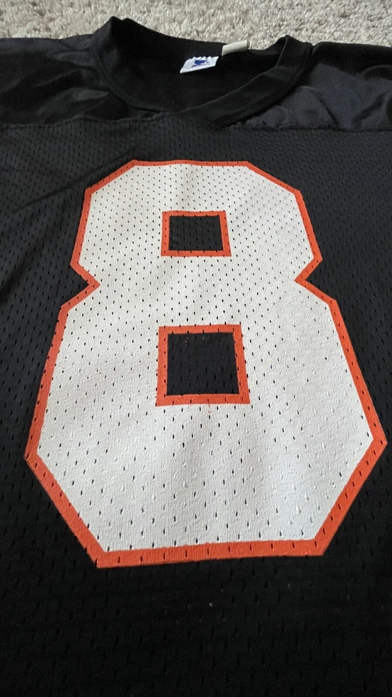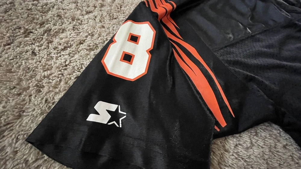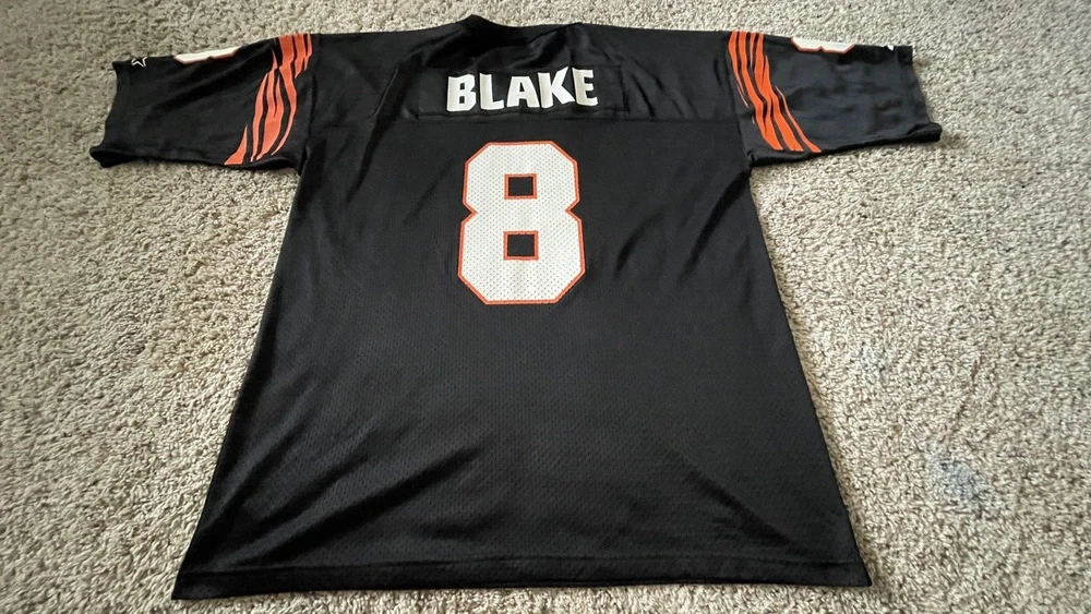 SELLING A RARE EXCELLENT CONDITION STARTER SIZE 54 XXL CINCINATI BENGALS FOOTBALL JERSEY #8 QB JEFF BLAKE - THIS IS A MUST HAVE FOR ANY WHO DEY FAN FOR GAME DAY! - THE ONLY FLAW I SEE IS VERY TINY MARK IN ONE OF THE STARTER LOGO - PICKY - ALSO SOME WHITE ON FRONT 8 IS STILL FULL SEE PIC - SHIPPING IS GROUND ADVANTAGE - FAST SHIPPING! MESSAGE ME WITH ANY QUESTIONS AND TAKE A LOOK AT MY OTHER SPORTS LISTINGS!