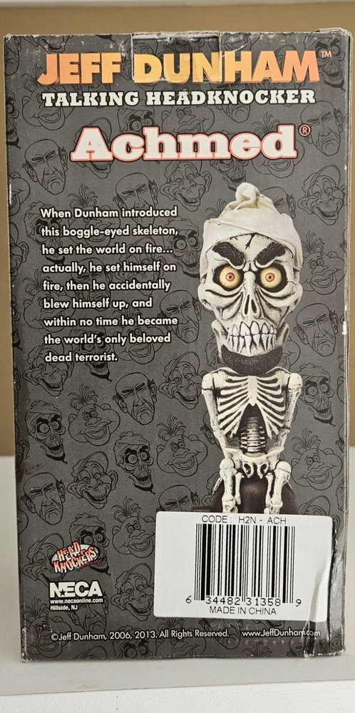 Experience the quirky humor of Jeff Dunham's "Achmed" Talking Headknocker from NECA. This collectible 3” wide x 7.75” tall bobble head doll, released in 2006, features the iconic silent character in a humorous design that perfectly captures the essence of Dunham's comedy. It's a must-have for fans and collectors alike, bringing a touch of laughter to any setting. Crafted with care by NECA, this bobblehead is a true representation of the character Achmed, with attention to detail that brings the figure to life. It's a unique addition to any collection, and a delightful way to celebrate the artistry of Jeff Dunham. Suitable for ages 14 and up, it's a fun gift for collectors or a playful treat for yourself.