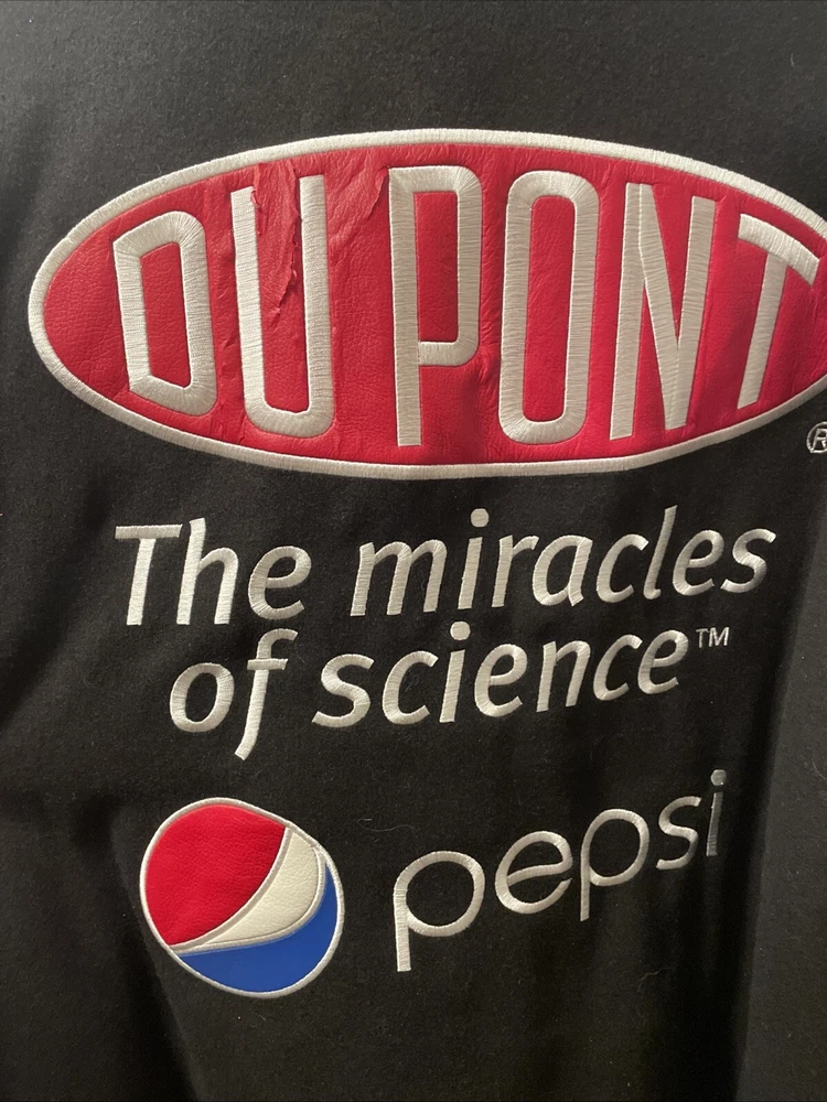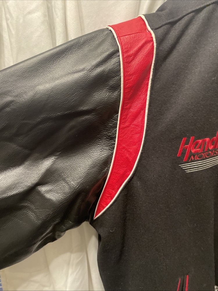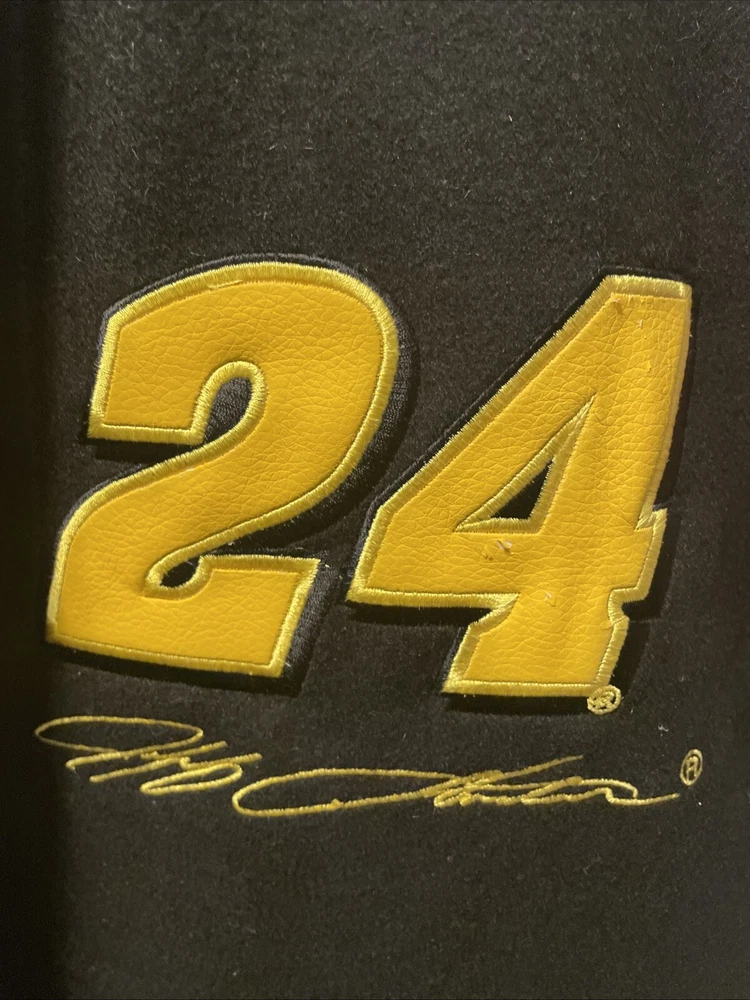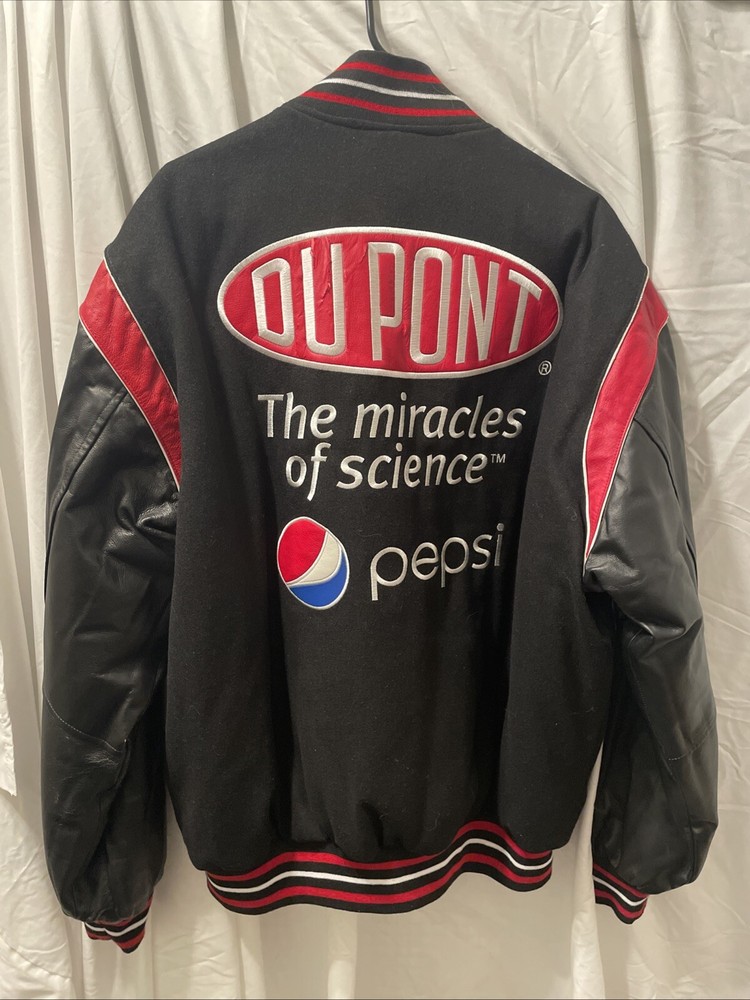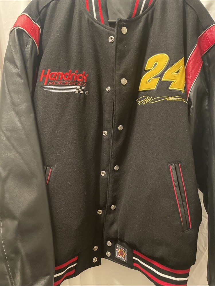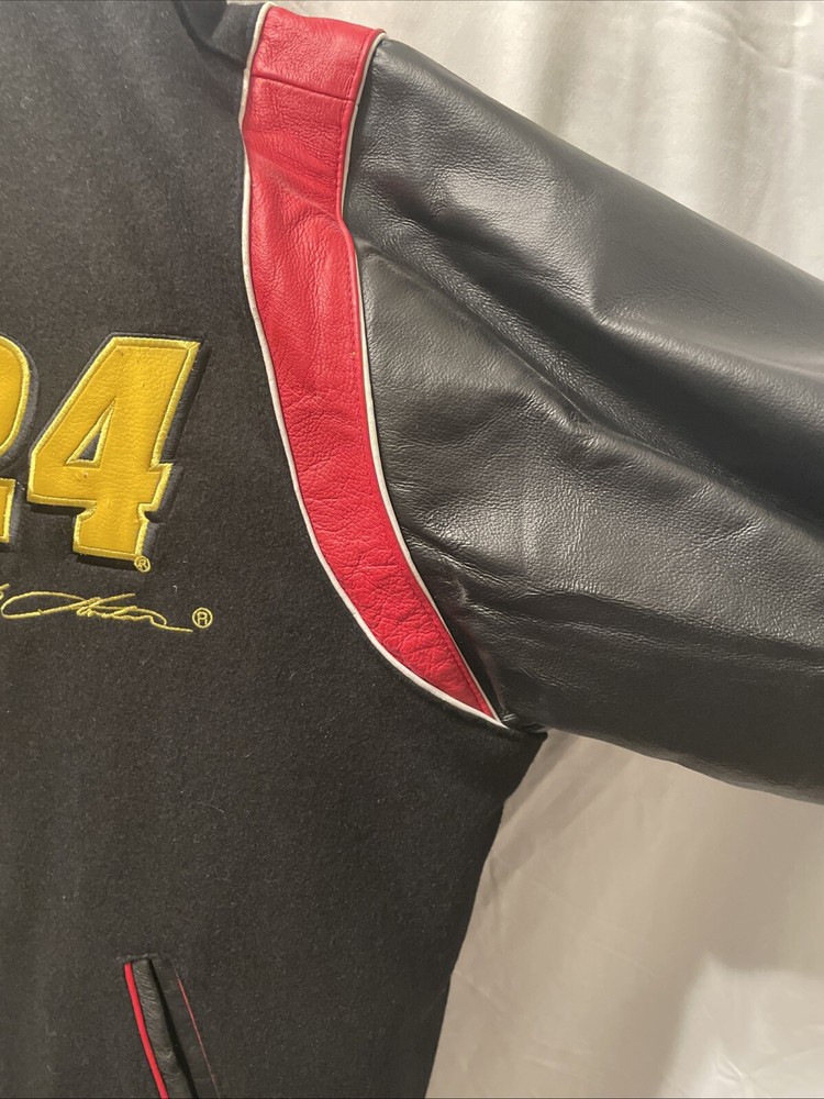 The JEFF GORDON DUPONT & PEPSI Wool and Leather Reversible jacket is designed with a stainless steel snap front closure, side pockets and a rib knit collar, cuffs and banded bottom on both sides. This team-colored jacket is officially licensed and displays the embroidered driver and team graphics on the chest, back and leather sleeves of the front. The driver's replica signature and car number is embroidered on the upper left chest of the reverse side. jacket is officially licensed and displays the embroidered driver and team graphics on the chest, back and leather sleeves of the front. The driver's replica signature and car number is embroidered on the upper left chest of the reverse side. Features Fiber Tag: Shell: 100% polyester; Lining 1 :30% wool; 50% acrylic; 20% nylon; Lining 2: Genuine Leather; Filler: 100% polyester Stainless steel snap front closure on both sides Driver and team graphics featured on the chest, back and leather sleeves on the front Reverse side displays the driver's replica signature and car number on the upper left chest Rib knit collar cuffs, and banded bottom Designed with pockets on both sides Decorated in the team colors Officially licensed Made in China SIZING Size S M L XL 2X Chest 34 36 39 42 45 Bottom 25/34 27/36 30/39 33/42 36/45 Back Length 19 19 1/2 20 20 1/2 21 Sleeve Length 25 1/2 26 1/2 27 1/2 28 1/2 29 1/2 Across Back 14 1/4 15 15 3/4 16 1/2 17 1/4 Cuff 6 6 1/2 6 1/2 7 7 1/2 Shoulder 5 3/8 5 1/2 5 3/4 6 6 1/4 Across Shoulder 15 1/2 16 1/4 17 17 3/4 18 1/2 Across Front 13 1/2 14 1/4 15 15 3/4 16 Armhole 19 20 21 22 23 Rib Height 2 1/2 2 1/2 2 1/2 2 1/2 2 1/2 Pocket 5 x 3/4 5 x 3/4 5 x 3/4 5 x 3/4 5 x 3/4 Collar Height 1 1/4 1 1/4 1 1/4 1 1/4 1 1/4 Front Stitch 1 1/4 1 1/4 1 1/4 1 1/4 1 1/4