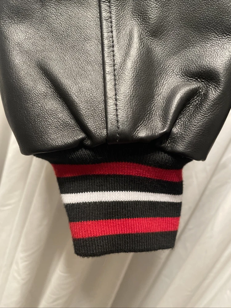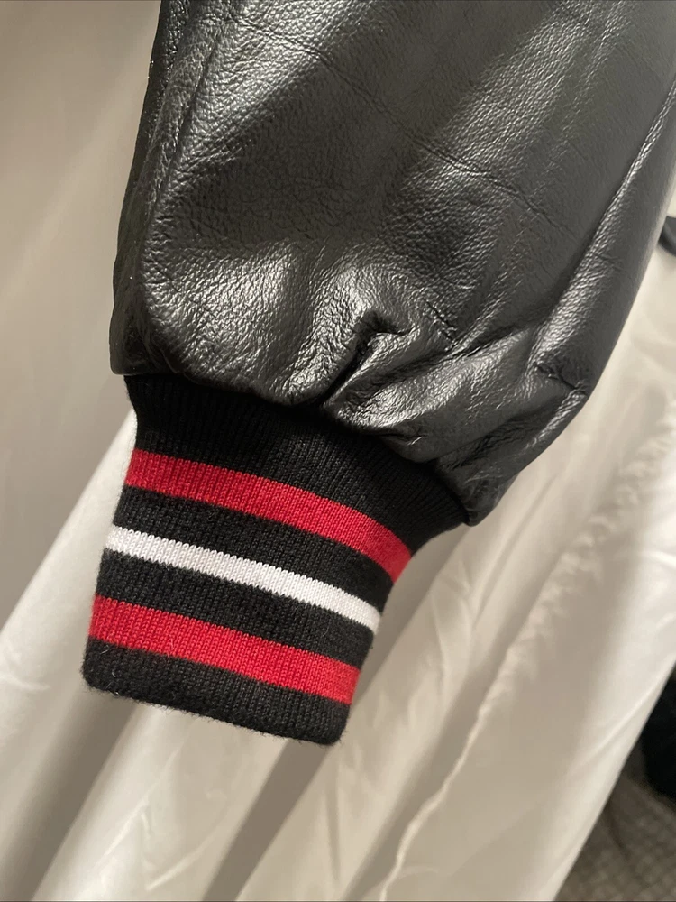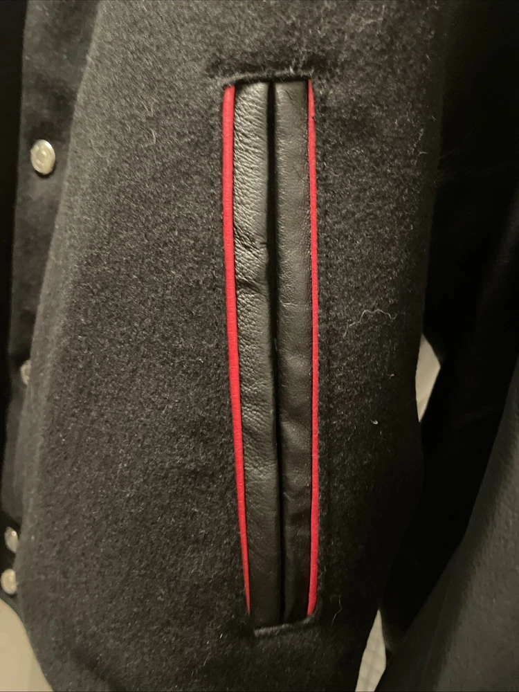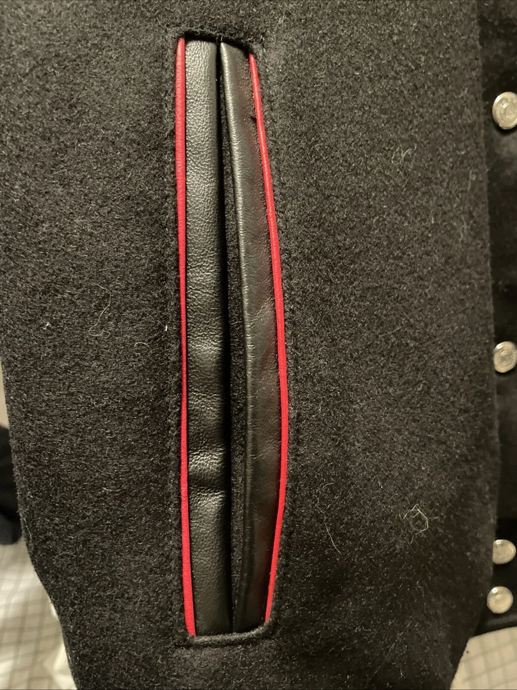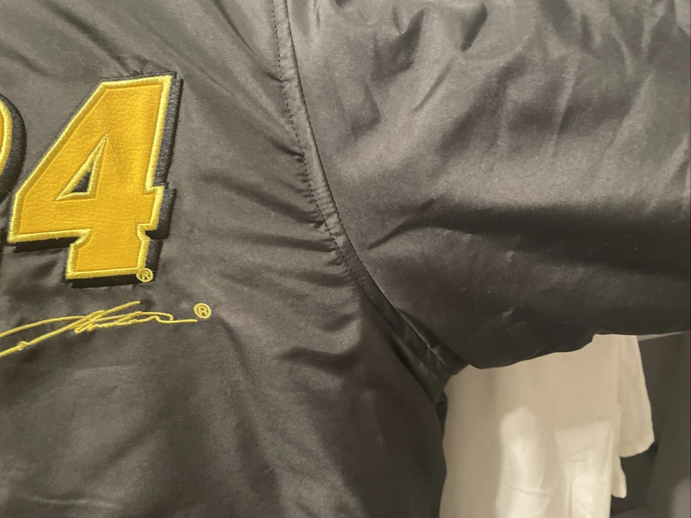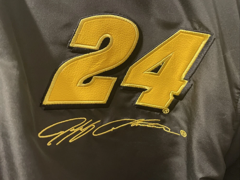 The JEFF GORDON DUPONT & PEPSI Wool and Leather Reversible jacket is designed with a stainless steel snap front closure, side pockets and a rib knit collar, cuffs and banded bottom on both sides. This team-colored jacket is officially licensed and displays the embroidered driver and team graphics on the chest, back and leather sleeves of the front. The driver's replica signature and car number is embroidered on the upper left chest of the reverse side. jacket is officially licensed and displays the embroidered driver and team graphics on the chest, back and leather sleeves of the front. The driver's replica signature and car number is embroidered on the upper left chest of the reverse side. Features Fiber Tag: Shell: 100% polyester; Lining 1 :30% wool; 50% acrylic; 20% nylon; Lining 2: Genuine Leather; Filler: 100% polyester Stainless steel snap front closure on both sides Driver and team graphics featured on the chest, back and leather sleeves on the front Reverse side displays the driver's replica signature and car number on the upper left chest Rib knit collar cuffs, and banded bottom Designed with pockets on both sides Decorated in the team colors Officially licensed Made in China SIZING Size S M L XL 2X Chest 34 36 39 42 45 Bottom 25/34 27/36 30/39 33/42 36/45 Back Length 19 19 1/2 20 20 1/2 21 Sleeve Length 25 1/2 26 1/2 27 1/2 28 1/2 29 1/2 Across Back 14 1/4 15 15 3/4 16 1/2 17 1/4 Cuff 6 6 1/2 6 1/2 7 7 1/2 Shoulder 5 3/8 5 1/2 5 3/4 6 6 1/4 Across Shoulder 15 1/2 16 1/4 17 17 3/4 18 1/2 Across Front 13 1/2 14 1/4 15 15 3/4 16 Armhole 19 20 21 22 23 Rib Height 2 1/2 2 1/2 2 1/2 2 1/2 2 1/2 Pocket 5 x 3/4 5 x 3/4 5 x 3/4 5 x 3/4 5 x 3/4 Collar Height 1 1/4 1 1/4 1 1/4 1 1/4 1 1/4 Front Stitch 1 1/4 1 1/4 1 1/4 1 1/4 1 1/4