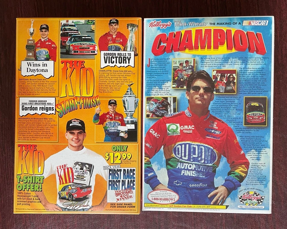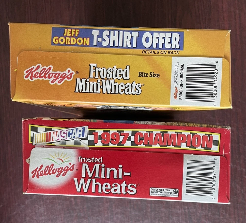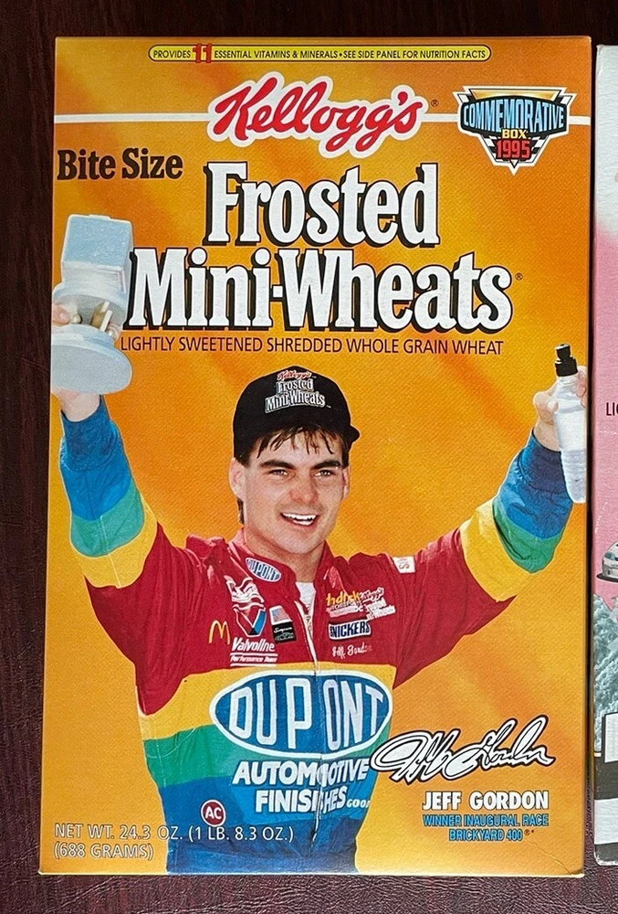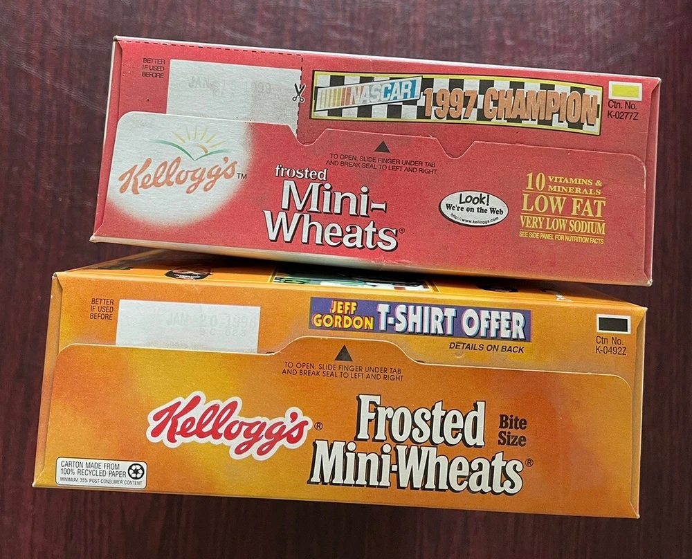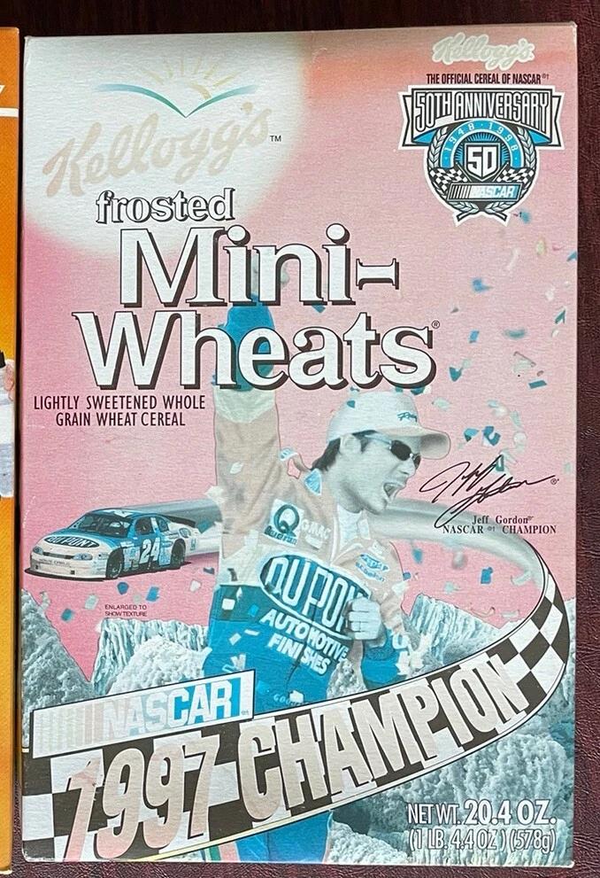 Jeff Gordon Frosted Mini Wheats Empty Cereal Boxes Lot Of 2 Empty boxes featuring Jeff Gordon Inaugural Brickyard 400 winner and 1997 NASCAR Champ Photos of actual boxes that you will receive More photos available upon request