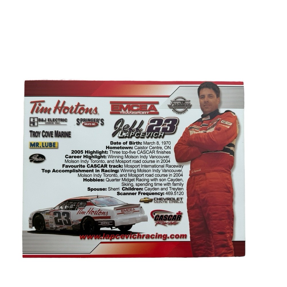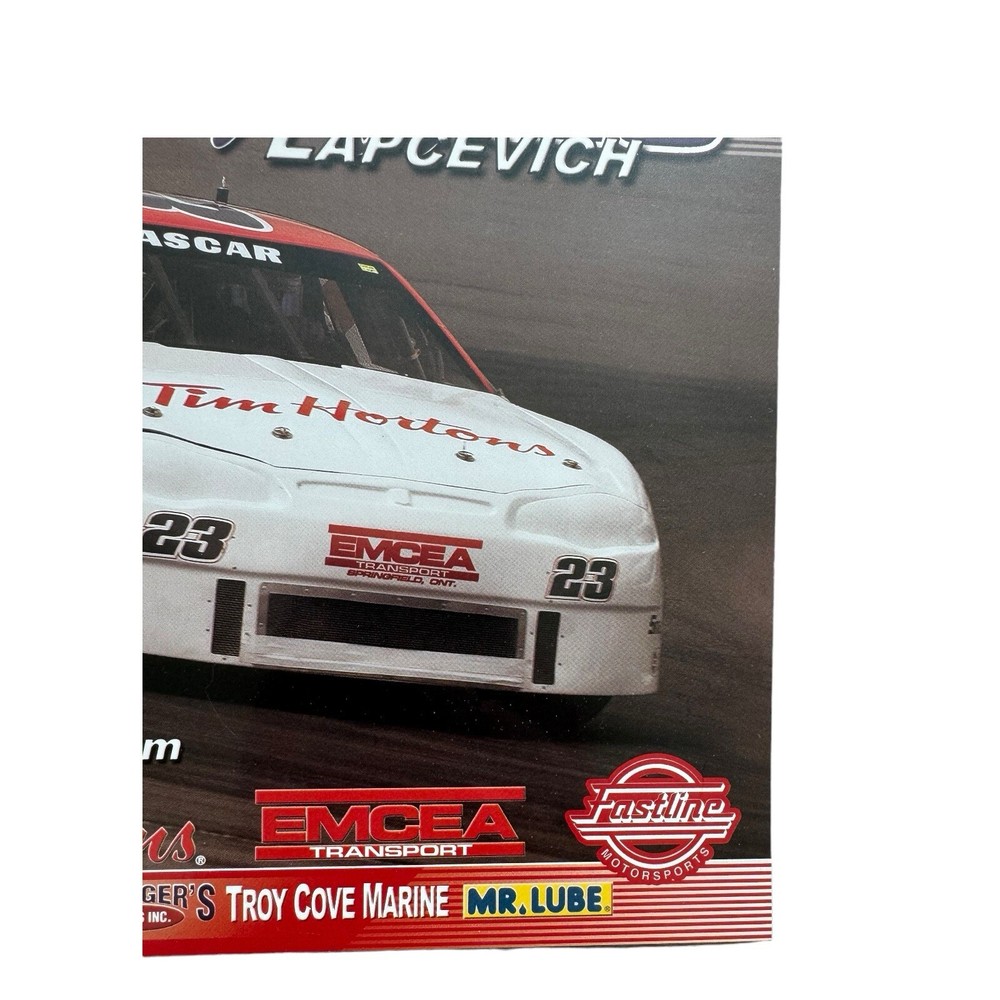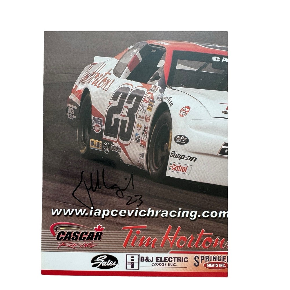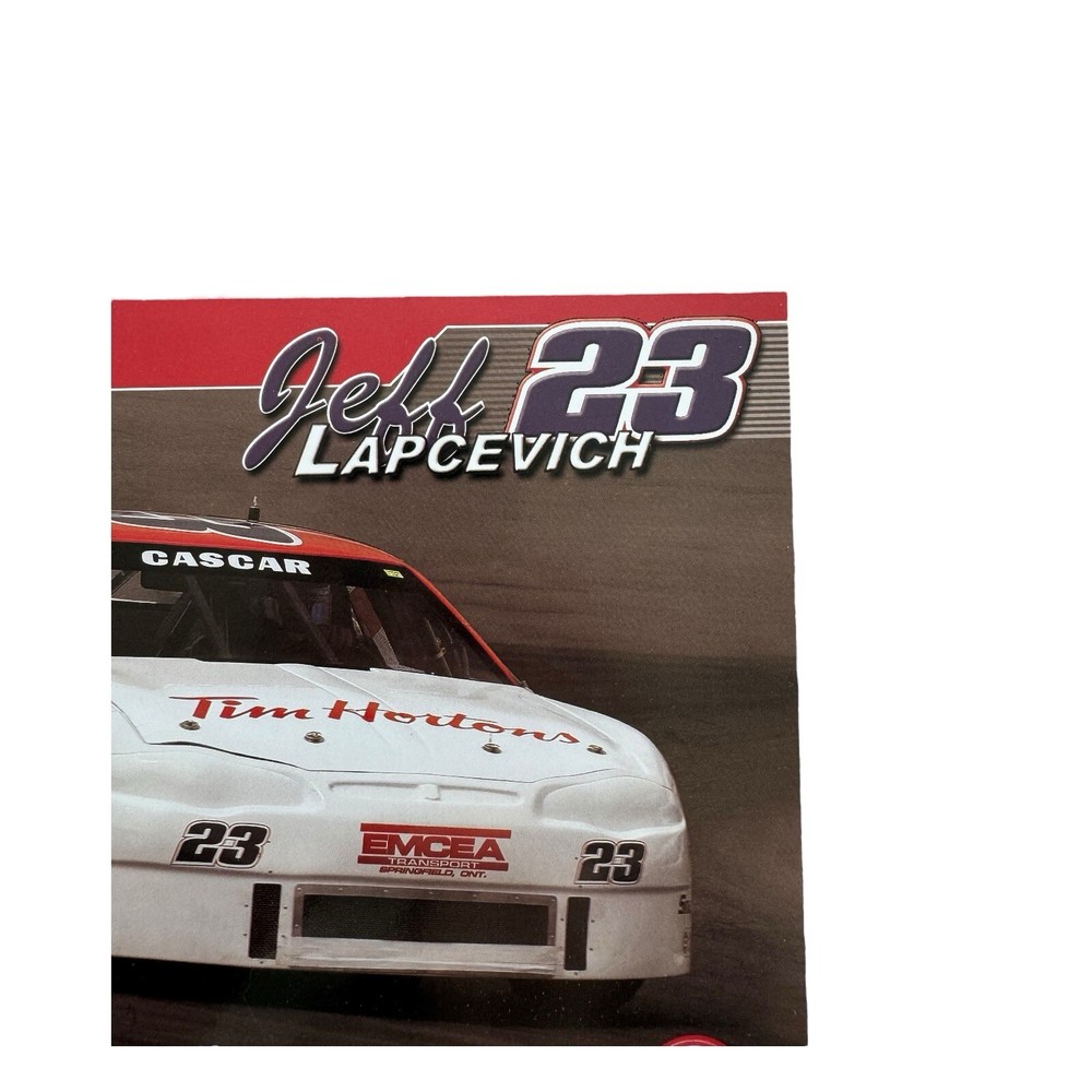 This autographed poster features Jeff Lapcevich, a prominent CASCAR driver, with his Tim Hortons Racing car, number 23. The poster is signed by Lapcevich, making it a valuable piece for any racing fan or collector of motorsports memorabilia. • Autographed by Jeff Lapcevich, CASCAR driver • Features the Tim Hortons Racing car, #23 • Includes sponsor logos and career highlights • Dimensions: approximately A4 • Excellent condition with vibrant colors • Perfect for racing fans and collectors