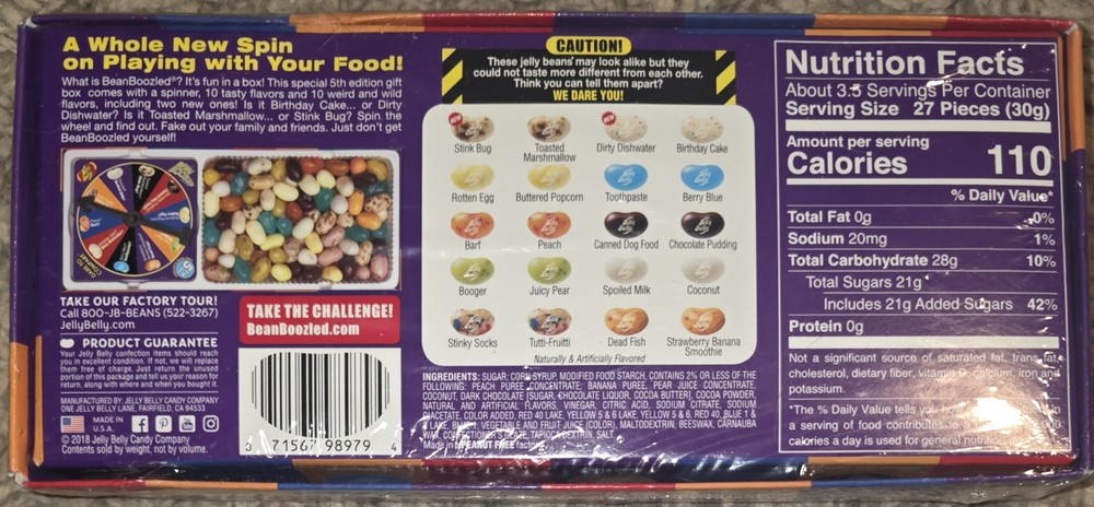 The Jelly Belly Bean Boozled Spinner Game is a fun and interesting way to enjoy a variety of weird and wild flavors of Jelly Belly jelly beans. With 36 beans in each pack, you can try a different flavor every time you spin the game. These jelly beans are fat-free, vegetarian, organic, gluten-free, dairy-free, kosher, and peanut-free, making them suitable for a wide range of dietary preferences. The themed around Jelly Beans, these candies are perfect for any occasion and are sure to bring joy to anyone who loves sweets.