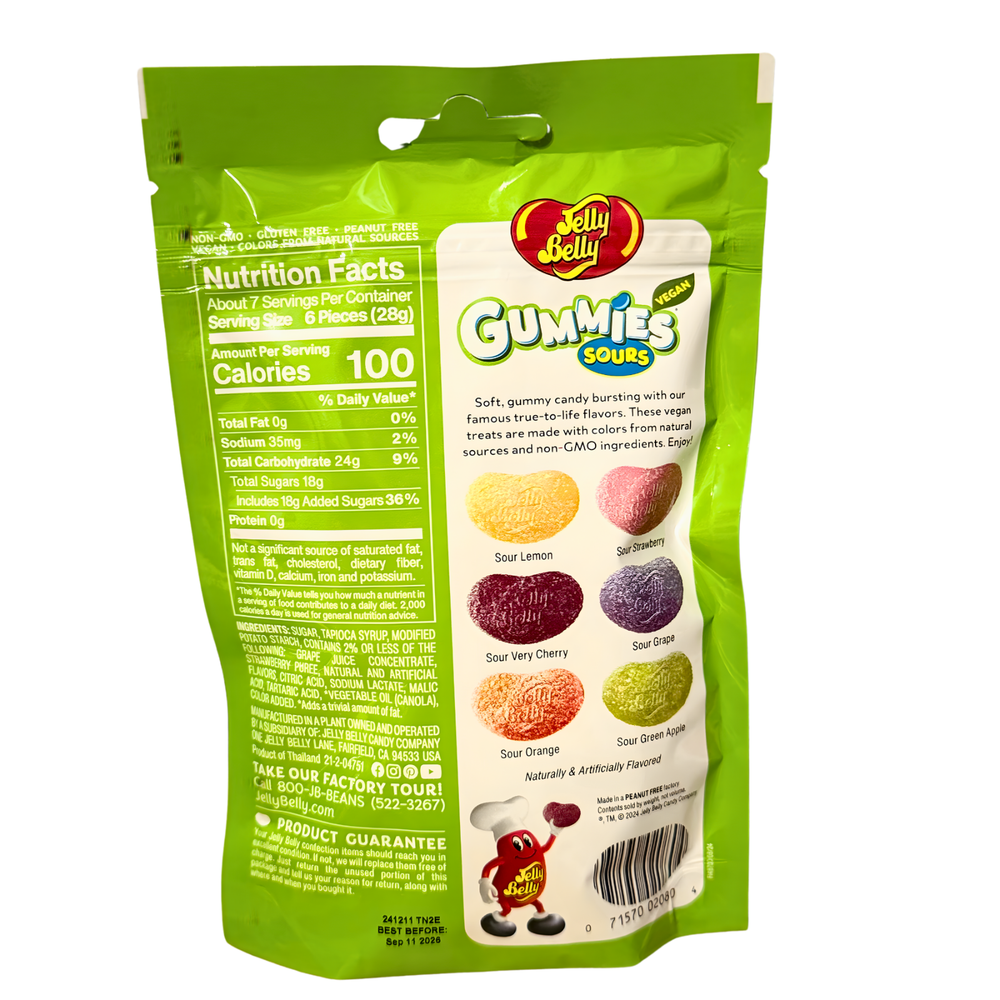 Product Name: Jelly Belly Gummy Sours 7 oz Vegan Non GMO Sour Gummy Candy Style: Jelly Beans Product: Not Available Food Aisle: Pantry gtin13: 071570020804 Item Weight: 198g Flavor: Lemon, Strawberry, Very Cherry, Grape, Orange, Green Apple Course: Snack & Candy Food Specifications: Gluten Free, Peanut Free, Vegan, non-GMO Number in Pack: 1 Bag Number of Servings: 7 UPC: 071570020804 Shape: Bean Occasion: Easter MPN: Does Not Apply Packaging: Bag Calories per Serving: 100 Regional Cuisine/Region: American Expiration Date: 9/2026 Serving Size: 28g Type: Gummy Country of Origin: United States Theme: Jelly Belly Brand: Jelly Belly