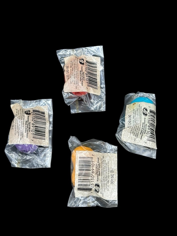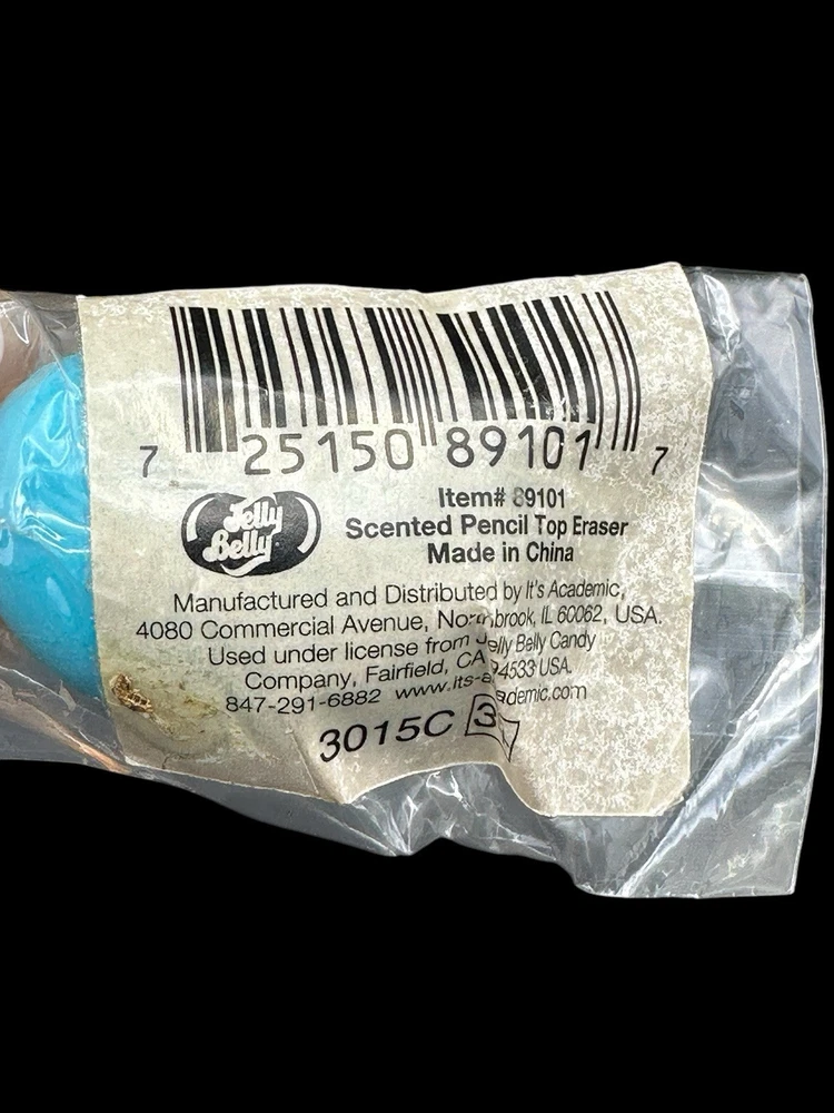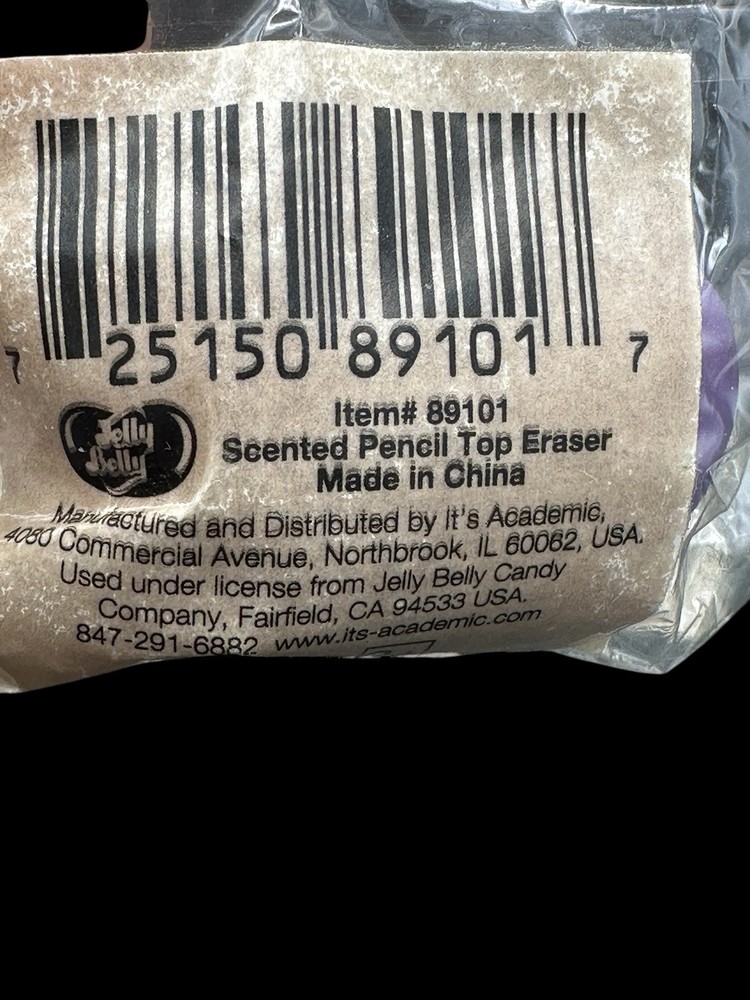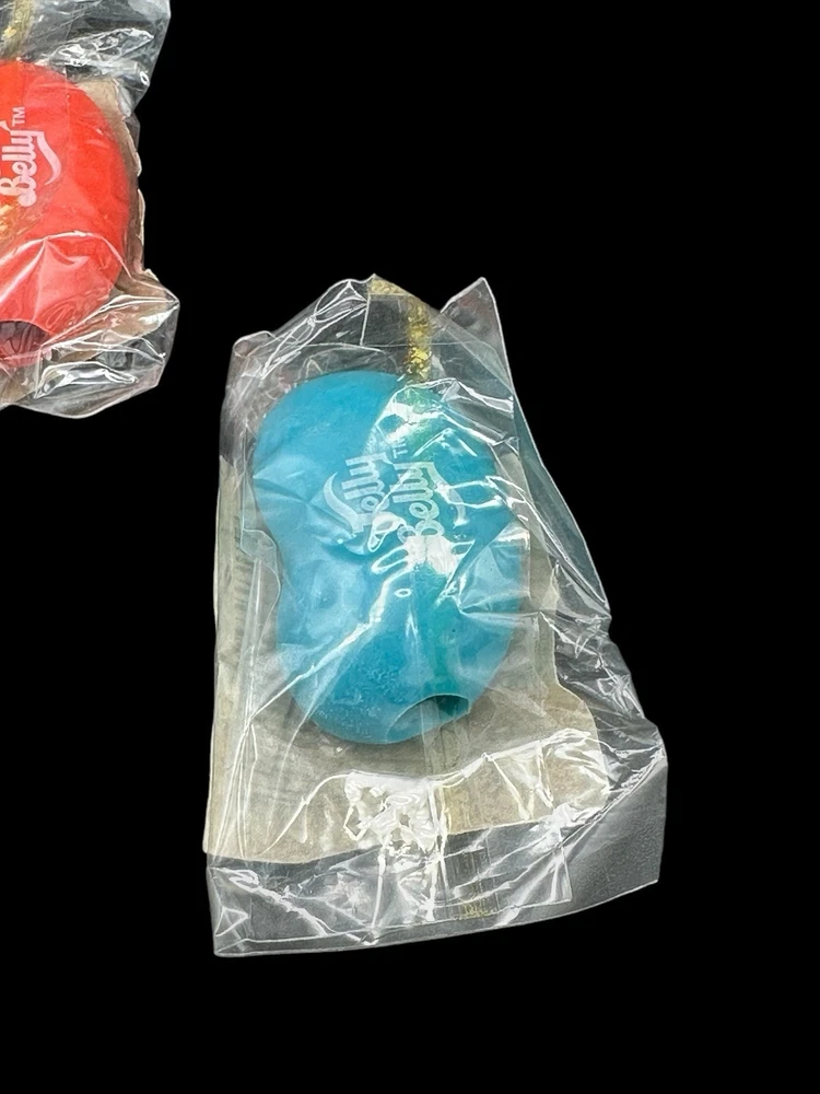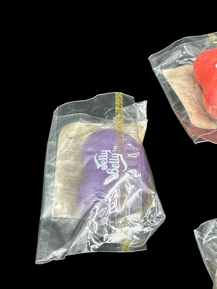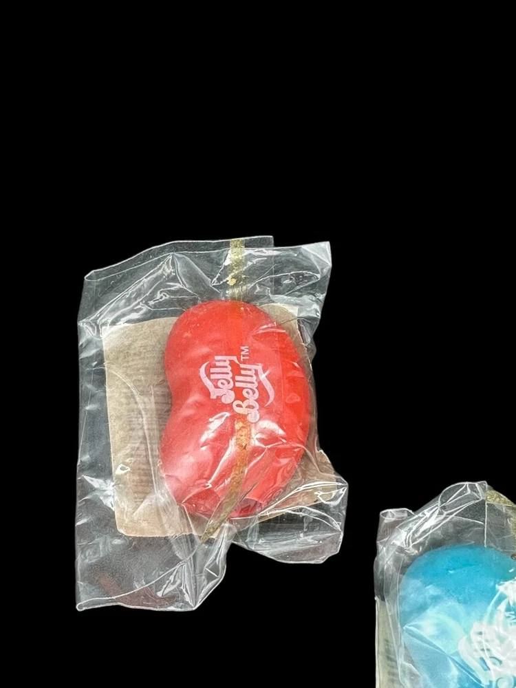 Jelly Belly Bean Scented Pencil Toppers Fragrant Purple Yellow Red Blue These are all very fragrant. Some of the baggies have lost their stickiness so don’t seal. The purple bean does not have a bag. It also has a spit on the tip. See pics. About 1 1/2” long