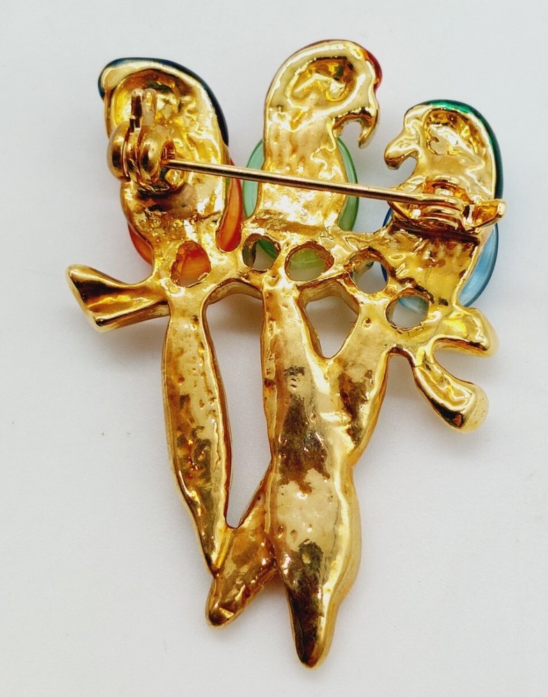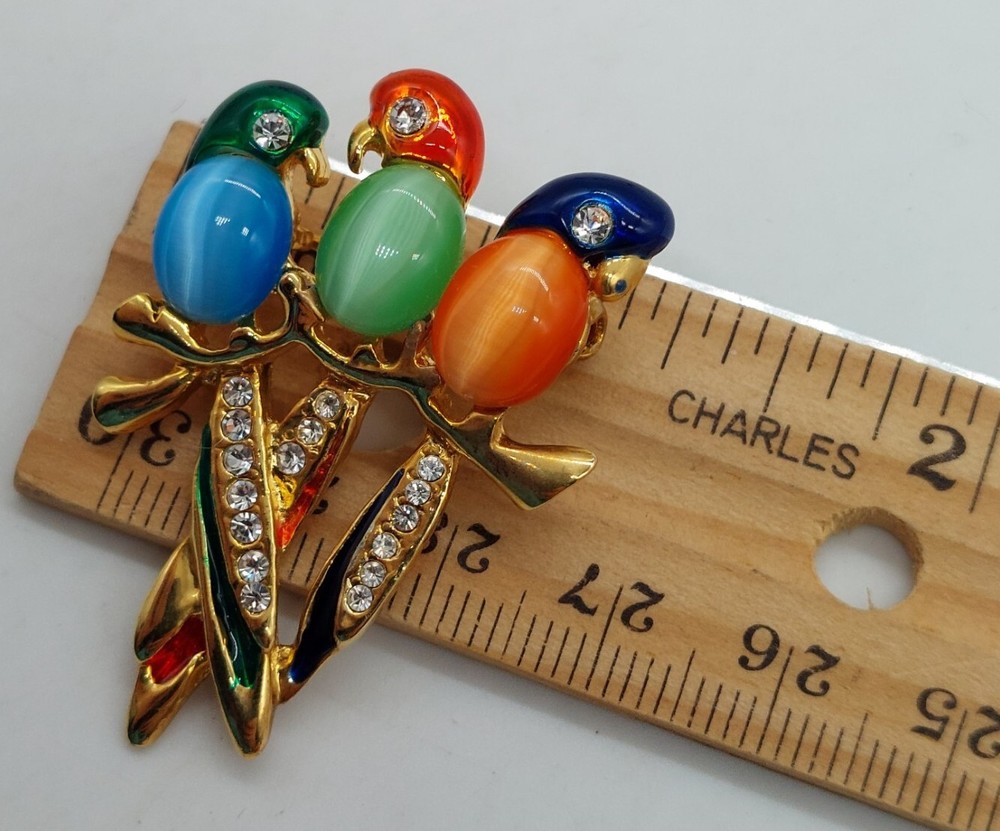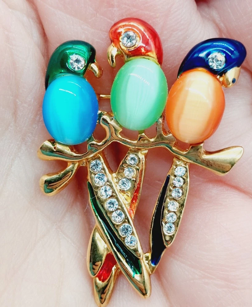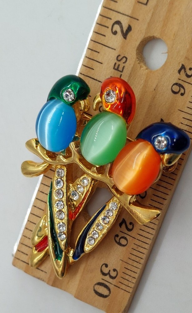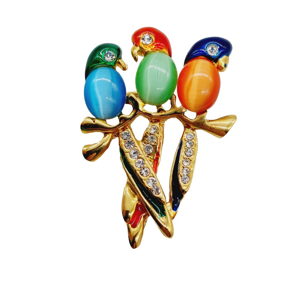 Jelly Belly Style Three Parrots Brooch Cats Eye Rhinestones Gold Tone Multicolor
